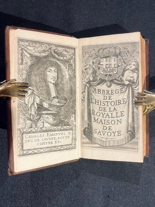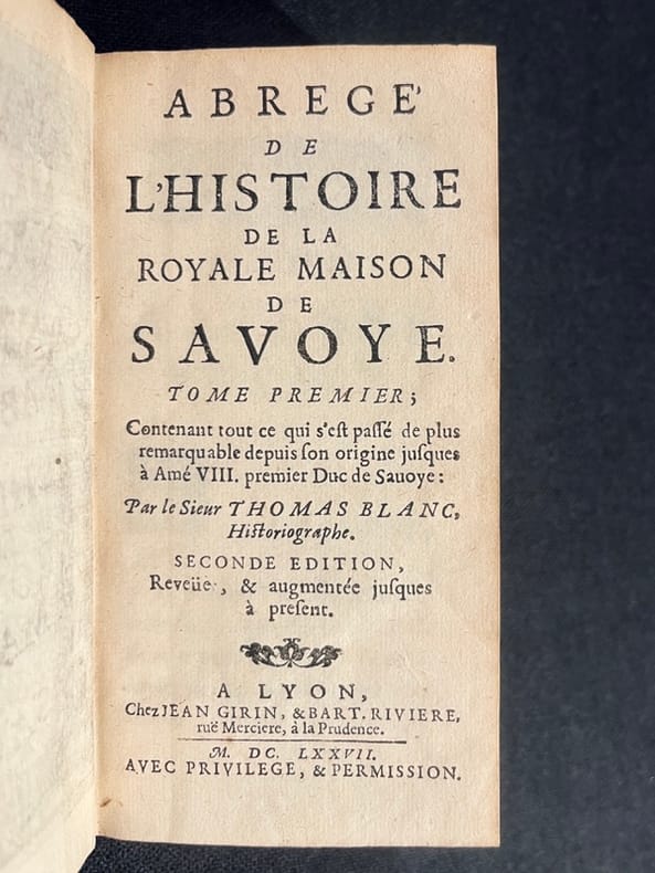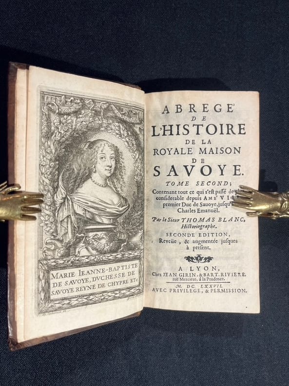 Beau titre gravé au premier volume et le portrait de Charles Emanuel II dessiné par de Lamonce ert gtavé par Germain Audran, au tome deuxième portrait de Marie Jeanne-Baptiste de Savoie dessiné et gravé par les mêmes. Sans le portrait au tome 3. Seconde édition d'un ouvrage peu commun. A la fin du dernier volume se trouve l'important Catalogue des chevaliers de l'ordre du Collier de Savoye, dit de l'Annonciade. Bel exemplaire, hormis une petite faiblesse à un nerf du tome 3. Foras 45; Brunet, VI, 25304.
