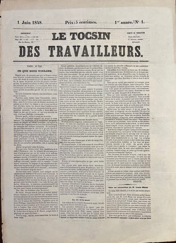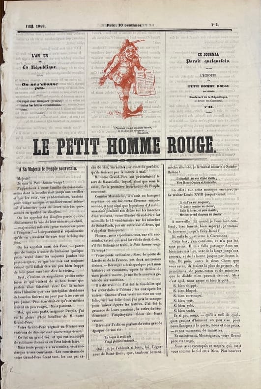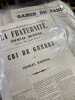 1848 Journaux éphémères du “printemps 1848”. Suite au renversement de la monarchie de Juillet, le 24 février 1848, la IIe République rétablit la liberté de la presse. “L’effet de cette mesure est immédiat. La liberté acquise permet à tous ceux qui en ont les moyens d’imprimer leur feuille: les titres nouveaux pullulent, les numéros un se multiplient; en quelques semaines, près de 300 titres se créent à Paris, presque autant en province” (Anne-Claude Ambroise-Rendu). Notre ensemble est effectivement essentiellement constitué de numéros 1 ainsi que de trois numéros spécimen. “Ces saturnales durent jusqu'aux journées de juin qui sont le point de départ d'une réaction toute naturelle. Le cautionnement est rétabli, des lois sont portées contre les crimes et délits de la presse. Le torrent, contenu par toutes sortes de digues, rentre enfin dans son lit, et ne roule plus, à partir de 1849, sauf quelques recrudescences momentanées, que des ondes de plus en plus inoffensives” (Hatin). Rareté parmi les journaux de 1848, "Le Petit homme rouge" semble être la seule publication à utiliser la couleur (Ambroise-Rendu). La vignette de titre de notre numéro (N°1, avril 1848) illustre un petit homme - imprimé… en rouge! Au bas, on lit: “L’homme rouge apparaît encore, il rit d’un air moqueur… Béranger”. L’exemplaire du journal "Le Travail" est illustré d’une jolie lithographie à pleine page de X. Maissner représentant les sœurs de la charité. Sur le titre, une vignette représente deux mains qui se serrent.Hatin "Bibliographie historique et critique de la presse périodique française". A.-C. Ambroise-Rendu "Les journaux du printemps 1848: une révolution médiatiques en trompe-l'oeil" in Revue d'histoire du XIXe siècle, n°19.