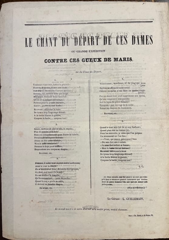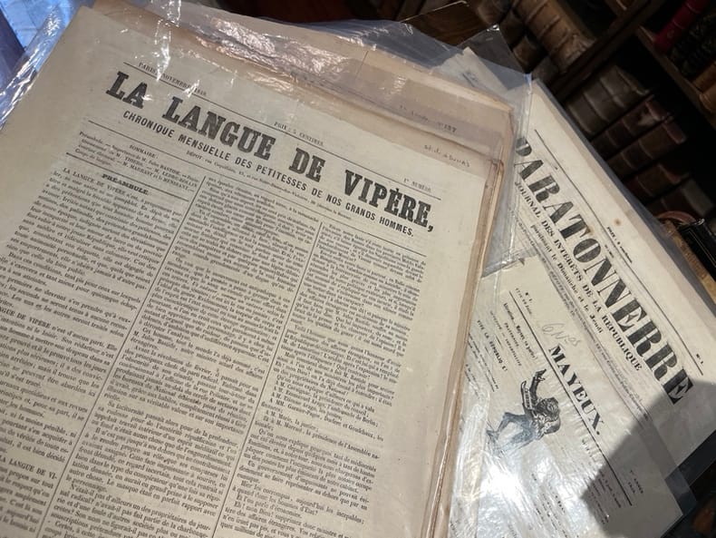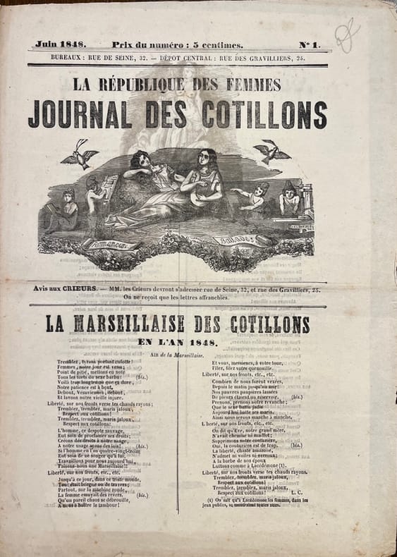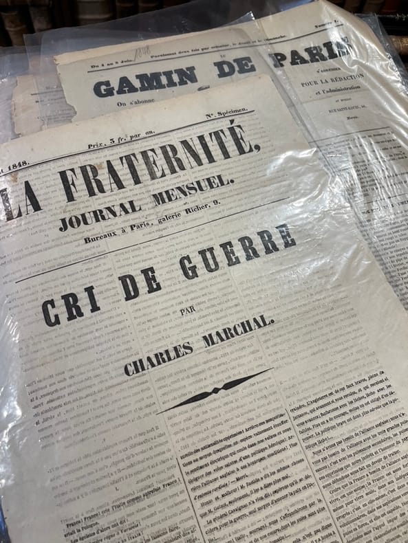 1. L’Accusateur public. Par Alphonse Esquiros. Première année N°1, Du 11 au 14 juin 1848. Quatre numéros parus jusqu’au 25 juin. [1] ff. n. ch. Hatin p.438. 2. L’Assemblée constituante. Journal de tous les intérêts. Première année N°1, Lundi 1er mai 1848. Quinze numéros parus jusqu’au 15 mai. Réd. en chef: M.B. Saint-Edme. [1] ff. n. ch. Hatin p.440. 3. Le Bonnet rouge. Drapeau des Sans-culottes. N°1, Dimanche 11 juin [1848]. "Tout citoyen qui n'est ni royaliste, ni aristocrate, ni mauvais riche, ni égoïste, ni modéré, mérite d'être honoré du titre honorable de sans-culotte." (Prudhomme, Révolutions de Paris.) Quatre numéros parus jusqu’au 18 juin. [1] ff. n. ch. Hatin p.443. 4. La Carmagnole. Journal des enfants de Paris. N°1, Jeudi 1er juin [1848]. Quatre numéros parus jusqu’au 15 juin. [1] ff. n. ch. Hatin p.446. 5. Charité et justice. Journal de propagande fraternelle paraissant tous les dimanches. Chacun pour tous, tous pour chacun. N°1, Dimanche 19 mars 1848. Deux numéros parus jusqu’au 26 mars. [1] ff. n. ch. Hatin p.447. 6. Le Christ républicain. Journal du citoyen Delclergues, administré par le citoyen Ridel. N°1, Jeudi 8 juin [1848]. Cinq numéros parus du 8 au 25 juin. [1] ff. n. ch. Hatin p.447. 7. La colère d’un vieux républicain contre tout le monde. N°1, [1er juin 1848]. Sept numéros parus jusqu’au 22 juin. [1] ff. n. ch. Hatin p.448. 8. Le Courrier Républicain de Versailles. Journal politique, judiciaire et littéraire du département de Seine-et-Oise. Numéro extraordinaire du mardi 14 mars 1848. Supplément du n°5. 4 pages. Manque chez Hatin. 9. Le Crédit. Journal quotidien. N° Spécimen, [17 septembre 1848]. Six cent quarante-six numéros parus du 1er novembre au 31 août 1850. Rédacteur en chef et fondateur: Ch. Duveyrier, ancien saint-simonien. [2] ff. n. ch. Hatin p.451. 10. Le Crédit. Journal quotidien. N°1, Mercredi 1er novembre 1848. Six cent quarante-six numéros parus jusqu’au 31 août 1850. Rédacteur en chef et fondateur: Ch. Duveyrier, ancien saint-simonien. [2] ff. n. ch. Hatin p.451. 11. Démocratie pacifique. 17ème année N°319, Samedi 25 novembre 1848. [2] ff. n. ch. Hatin p.385. 12. Diogène Sans-Culotte. Première année N°1, Du 18 au 22 juin 1848. Deux numéros parus entre le 18 et le 25 juin. [2] ff. n. ch. Hatin p.452. 13. L'Éducation républicaine. Journal des maîtres d’études des lycées de la république paraissant tous les quinze jours. Première année N°1, Dimanche 20 mai 1848. Paru jusqu’en mars 1850. 4 pages. Hatin p.459. 14. L’Ère nouvelle. N°1, Samedi 15 avril 1848. Paru jusqu’au 1er juin 1849. Rédacteur en chef: le P. Lacordaire; collaborateurs: l’abbé Maret, Frédéric Ozanam, de Coux, etc. [2] ff. n. ch. Hatin p.459. 15. L’Esprit National. Première année, Vendredi 5 mai 1848. Trente-deux numéros parus du 2 mai au 8 juin. [2] ff. n. ch. Hatin p.460. 16. L’Etoile du Matin. Journal du Contribuable et du Travailleur. N°1 Prospectus, Lyon, le 20 mars 1848. Six numéros en cinq parutions (n°5/6). 4 pages. Manque à Hatin. 17. La Fraternité. Journal mensuel. Cri de guerre par Charles Marchal. N° Spécimen, Août 1848. Unique numéro paru. [1] ff. n. ch. Hatin p.464. 18. Le Gamin de Paris. N°1, Du 4 au 8 juin [1848]. Huit numéros parus. [1] ff. n. ch. Hatin p.465. 19. La Garde mobile. Journal illustré. Première année N°1, Dimanche 6 août 1848. Rédacteur en chef, Auguste Saint-Arroman. Deuxième numéro paru le 13 août. [2] ff. n. ch. Hatin p.466. 20. Le Guide des électeurs. Journal politique, mensuel. Septembre 1848. [2] ff. n. ch. Hatin p.467. 21. L’Impitoyable. Journal de tous les abus publics. Première année N°1, Dimanche 3 septembre 1848. Rédacteur en chef: Victor Letellier. Seul numéro paru. 4 pages. Hatin p.468. 22. L’indépendant. Journal quotidien, politique et littéraire. Liberté! Vérité! Première année N°2, Mardi 16 mai 1848. Vingt-cinq numéros parus jusqu’au 11 juin. En 3ème page, lithographie en mi-page. [2] ff. n. ch. Hatin p.468. 23. Le Journal. Rédacteur en chef, Alphonse Karr. Première année N°1, Vendredi 28 juillet 1848. Nonante-six numéros parus jusqu’au 31 octobre. [2] ff. n. ch. Hatin p.468. 24. Journal des Sans-Culottes. Par le citoyen Constant Hilbey. Sept numéros parus du 28 mai 1848 à mars 1849. Complet. Hatin p.470. 25. Le Lampion. Eclaireur Politique. Première année N°1, Dimanche 28 mai 1848. Rédacteurs-directeurs: L. Boyer, X de Montépin, de Villemessant. Quarante-deux numéros parus jusqu’au 21 août. [2] ff. n. ch. Hatin p.471-472. 26. La Langue de vipère. Chronique mensuelle des petitesses de nos grands hommes. N°1, Paris, Novembre 1848. Huit numéros parus jusqu’en juin 1849. Auteur utilisant le pseudonyme J.-Jacques. [1] ff. n. ch. Hatin p.472. 27. La Liberté. Journal des Idées et des Faits. Première année, N°26, Dimanche 26 mars 1848. [2] ff. n. ch. C’est le deuxième article d’Alexandre Dumas dans La Liberté qui est intitulé « Profession de foi de l’avenir. La République seule est possible ». « Ce fut le 25 mars 1848 que l’illustre romancier [Alexandre Dumas] fit son entrée solennelle à la Liberté. » Hatin p.473-476. 28. La Liberté. Journal des peuples. Première année, N°105, Mardi 13 juin 1848. [2] ff. n. ch. Hatin p.473-476. 29. La Liberté. Journal des peuples. Première année N°105, Jeudi 15 juin 1848. [2] ff. n. ch. Hatin p.473-476. 30. Mayeux. Première année N°1, 17 et 19 juin 1848. Six numéros parus jusqu’au 10 juillet. [2] ff. n. ch. Hatin p. 476. 31. Le Messager. Journal politique et littéraire. Première année N°137, Dimanche 27 août 1848. 132 numéros parus du 4 avril au 6 septembre. [2] ff. n. ch. Hatin p.477. 32. Le Monde républicain. N°15, Samedi 15 avril 1848. Les quatre premiers numéros furent publiés initialement sous le titre Le Monde de 1848. Rédaction. Desjobert, Gally, Pierre Zaccone, Henry de Kock. 86 num
