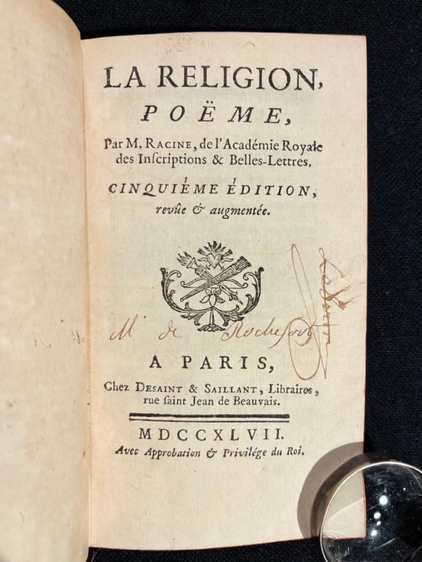 Par le fils de l'illustre Jean Racine. Bel exemplaire. Ex-libris autographe au titre M. de Rochefort et Lebrun. Travail d'insectes au dos sans atteinte au papier.