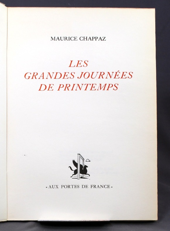 1967 [Lausanne]: Cahier de la Renaissance vaudoise, [Bertil Galland], 1967. Cinq vol. in-8 brochés et un portfolio, sous étui: 17x25.5 cm. I/ 1 pl. grav., 51-[6] pp.; II/ 1 pl. grav., 69-[4] pp.; III/ 1 pl. grav., 96-[5] pp.; IV/ 1 pl. grav., 51-[6] pp.; v/ 1 pl. grav., 68-[5] pp.; Portfolio/ 1 f. manuscrit, 5 pl. grav. Le présent coffret regroupe les Verdures de la nuit, paru en 1945, Les grandes journées de printemps, en 1944, Le Testament du Haut-Rhône, en 1953, lOffice des morts et Tendres campagnes lannée précédente, en 1966. Chaque volume est illustré dune composition originale de Palézieux, en frontispice. Les cinq volumes sont complétés dun portfolio regroupant la suite des compositions de Palézieux. Édition imprimée à 1729 exemplaires. Celui-ci, lun des 103 exemplaires de tête sur vélin pur chiffon dArches (no 13), signé par Chappaz et Palézieux. Dos légèrement insolé. Très beaux volumes, à grandes marges, non ébarbés et non coupés. En bel état.