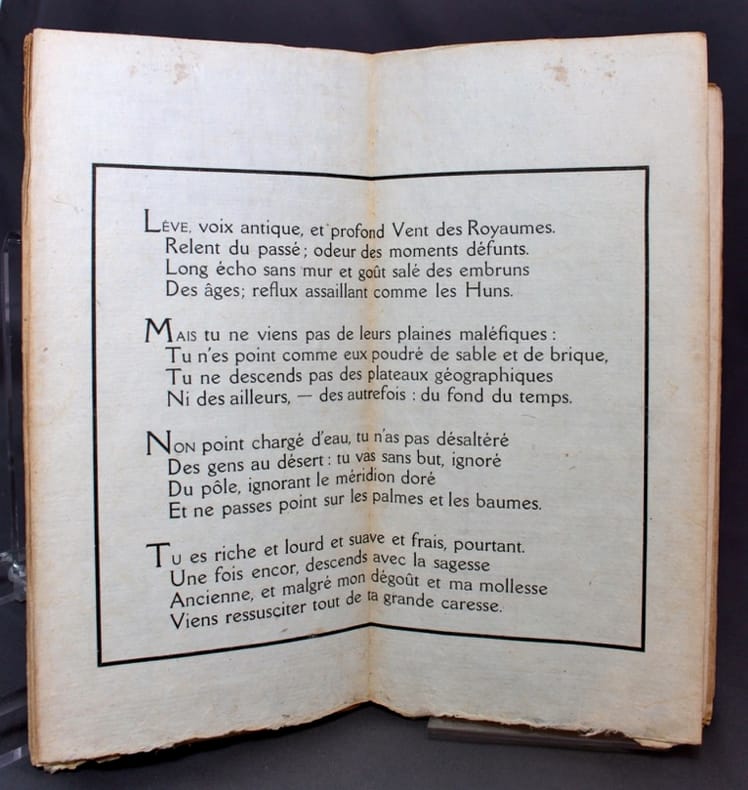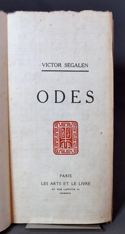 Tiré à 350 exemplaires, un des 30 imprimés sur papier coréen (n° 27), seul tirage de tête, celui-ci hors commerce. Ces 30 exemplaires sont légèrement plus grands que les 320 sur Montval du tirage ordinaire. Première édition (posthume) de ce recueil qui ferme l'oeuvre entreprise avec "Stèles" paru en 1912 ou Segalen annonçait au faux-titre : "Il sera donné : Stèles, Peintures & Odes". Edition originale.Printed in 350 copies, one of 30 printed on Korean paper (#27), only head print, this one privately printed. These 30 copies are slightly larger than the 320 on Montval of the ordinary print. First edition (posthumous) of this collection which closes the work started with "Stèles" published in 1912 where Segalen announced under the half-title: "Il sera donné : Stèles, Peintures & Odes".