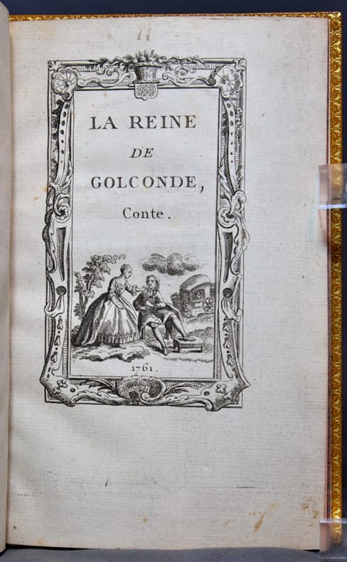Joli titre entièrement gravé. Édition originale très rare. La Reine de Golconde (1761) est un conte philosophique légèrement licencieux. Ex-libris Léon Rattier, dont la bibliothèque fut mise à l'encan vers 1920.
