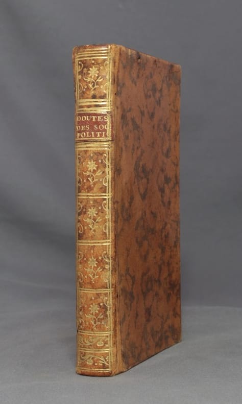 A La Haye, et se trouve à Paris, chez Nyon, et chez Veuve Durand, 1768, 1 volume in-12 de 170x100 mm environ, viij-316 pages, plein veau granité fauve, dos lisse portant titres dorés sur pièce de titre en maroquin bordeaux, orné à la grotesque (une série de chaînettes dorées disposées à lidentique), coupes dorées, tranches et gardes marbrées. Edition originale. Petites épidermures sur le cuir, dorure un peu effacée sur les coupes, sinon bon état. UNe attaque virulente de la Physiocratie.