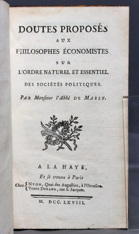Edition originale. C'est une réfutation de Mercier de La Rivière (L'ordre naturel et essentiel des sociétés politiques, 1767) et des physiocrates. Mably s'oppose au despotisme légal défendu par Mercier. Il y "prône ouvertement l'égalité des conditions et la communauté des biens" (Sauvy). L'ouvrage eut un grand retentissement en Pologne où Mably fut appelé pour rédiger une constitution nouvelle. Cioranescu, 41179; INED, 2991; Tchemerzine-Scheler IV, 251a.