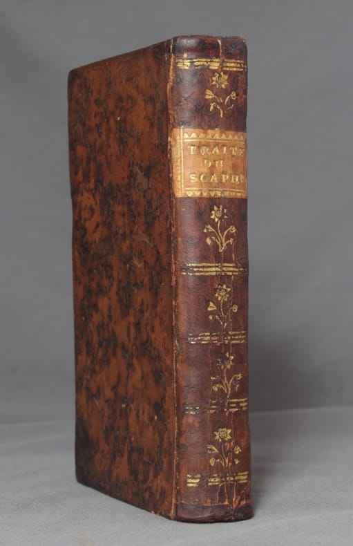 Illustré de 4 planches imprimées sur deux feuillets dépliants, dessinées et gravées par J. Robert. Édition originale. L'Abbé Jean-Baptiste de La Chapelle, né vers 1710 et mort probablement en 1792 à Paris, est un mathématicien français. Il a contribué aux parties mathématiques de l’Encyclopédie. Il est l'inventeur du mot « scaphandre ». La notoriété de La Chapelle s’accrut en 1765 avec ses expériences avec un gilet de natation en liège qu’il donnait comme de son invention. Devant un grand public, il sauta dans la Seine, mangeant, buvant, prisant, déchargeant un pistolet et écrivant tout en flottant à la surface. Il voulut répéter, trois ans plus tard, cette démonstration devant Louis XV près du pavillon de chasse royal en forêt de Sénart, mais sa tentative échoua lorsque le courant l’entraîna à une telle vitesse que le roi ne put identifier ce qui passait devant lui. En 1775 paraissait son Traité de la construction théorique et pratique du scaphandre ou du bateau de l’homme relatant ses expériences. Au verso de la page de garde signature (?) du Comte de la Pérouse; et relié à la fin un feuillet manuscrit qui relate une démonstration du scaphandre en 1814. Épidermures sur les mors.