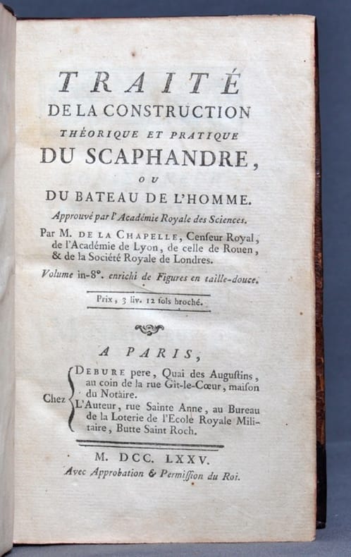 1 volume in-8° relié plein veau noisette marbré, dos à nerfs, pièce de titre de maroquin bordeaux, tranches cailloutées, restauration en coiffe supérieure, petites bandes rousses en bordure des pages de titre et faux-titre, XLVIII, 328 p. 3 ff.nch., IV planches sur deux planches dépliantes. Très bel exemplaire aux Armes de Pavée de Vendeuvre (XIXe siècle). (Dédié à Antoine de Sartine, ministre de la Marine, approuvé par l'Académie royale des sciences, cet ouvrage de l'abbé de La Chapelle, mathématicien de renom, expose le moyen de marcher au milieu des eaux les plus profondes comme sur un plan solide à l'aide d'une combinaison de toile avec appliques de liège. Équipement de flottaison non submersible, cette première forme du scaphandre, composée d'un pantalon à étriers, d'une suspensoire - sorte de plastron venant se rabattre sur la poitrine - et de nageoires pour aider à la progression, se veut utile pour l'amusement, la pêche, la survie en cas de naufrage ou bien encore le calfatage d'un bateau en mer. Le traité sera réédité en 1805 précédé du projet de formation d'une légion nautique ou d'éclaireurs des côtes, destinée à opérer tel débarquements qu'on avisera sans le secours de vaisseaux. Source : BNF).