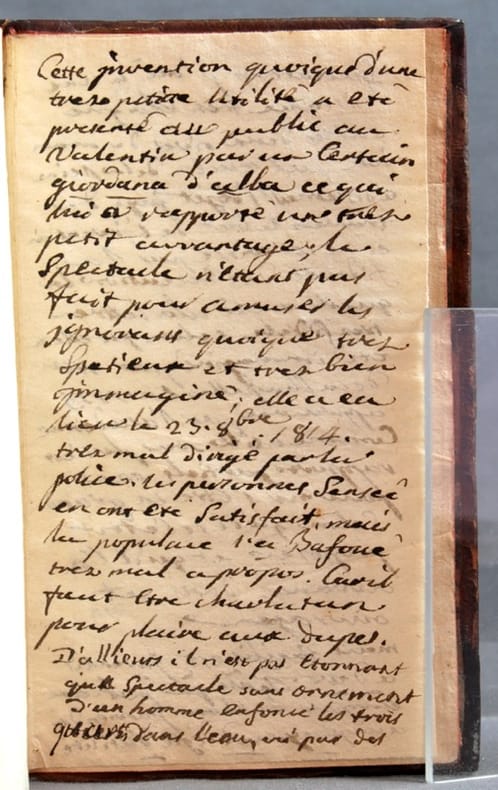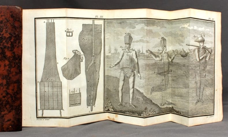 Edition originale. L'auteur, l'un des collaborateurs de l'Encyclopédie propose un vêtement formé de toile enduite et de liège permettant de se mouvoir sur l'eau en demeurant au sec. Il en fit la démonstration, fumant ou écrivant en traversant le Rhin. Ce mathématicien loufoque, aussi auteur d'un essai sur la ventriloquie, est à l'origine du mot scaphandre. Le traité - qui sera réimprimé en 1805 à l'occasion d'un projet de création d'une légion nautique - est orné de 4 planches très bien gravées sur deux grandes planches dépliantes.Ex-libris manuscrit sur le faux-titre de [François-Xavier de Froissard] chevalier de Bersailin, ancien officier au régiment de Strasbourg. Très bel exemplaire, bien relié et parfaitement frais.
