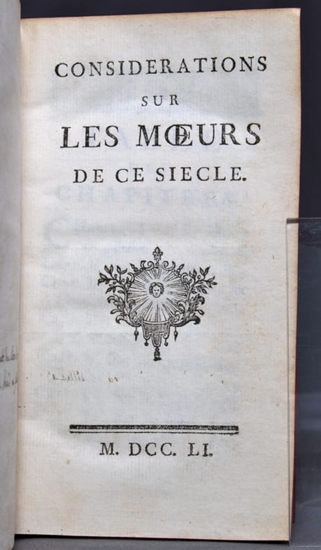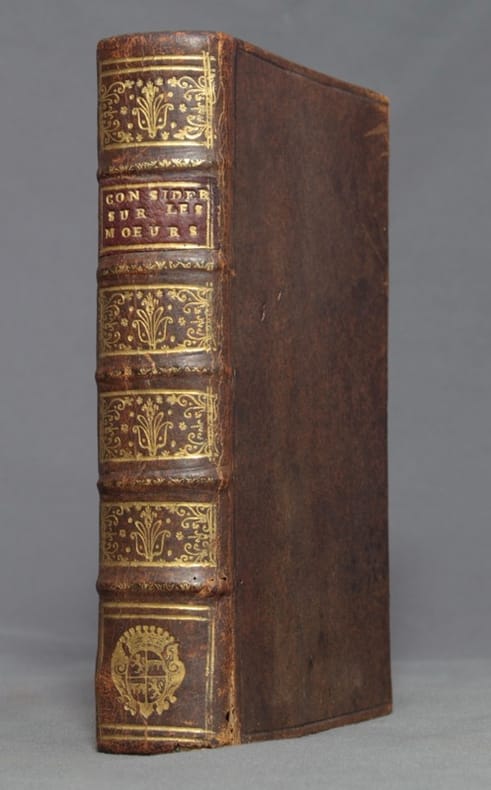 Le second ouvrage est illustré de trois vignettes de De Sève, gravées par Fessard. On mentionne parfois un frontispice, qui n'est pas présent.The second work is illustrated with 3 vignettes by De Sève, engraved by Fessard. Sometimes a frontispiece is mentioned, which is not present here. Bel exemplaire de cette véritable édition originale "devant être préférée à celle qui porte le nom de Prault, 1751" (Quérard), car elle est antérieure: notre exemplaire comporte une correction manuscrite à l'encre, de l'époque, qui sera prise en compte dans l'édition suivante (ladite "Prault, 1751"). "Les Considérations sur les mœurs de ce siècle passent avec raison pour le tableau le plus intéressant que nous ait laissé le siècle dernier : on a dit qu’elles étaient le chef-d’œuvre de Duclos. Louis XV qui l’estimait particulièrement lui avait délivré des lettres de noblesse. " (T. Tastet). Le roi Louis XV dira des Considérations: "C’est l’ouvrage d’un honnête homme". La Théorie des sentiments agréables est ici dans sa troisième édition, la seconde mise dans le commerce, avec une préface de Jean Jacob Vernet.Beautiful copy of this true original edition "devant être préférée à celle qui porte le nom de Prault, 1751" (Quérard), because it is earlier: our copy includes a handwritten correction in ink, of the time, which will be taken into account in the following edition (the so-called "Prault, 1751"). The Considérations sur les moeurs de ce siècle pass with reason for the most interesting picture that the eighteenth century has left us: it has been said that they were the masterpiece of Duclos. Louis XV, who particularly valued the author, had granted him letters of nobility. King Louis XV will say about the book "It is the work of an honest man". The Théorie des sentimens agréables is here in its third edition, the second release on the market, with a preface by Jean Jacob Vernet.