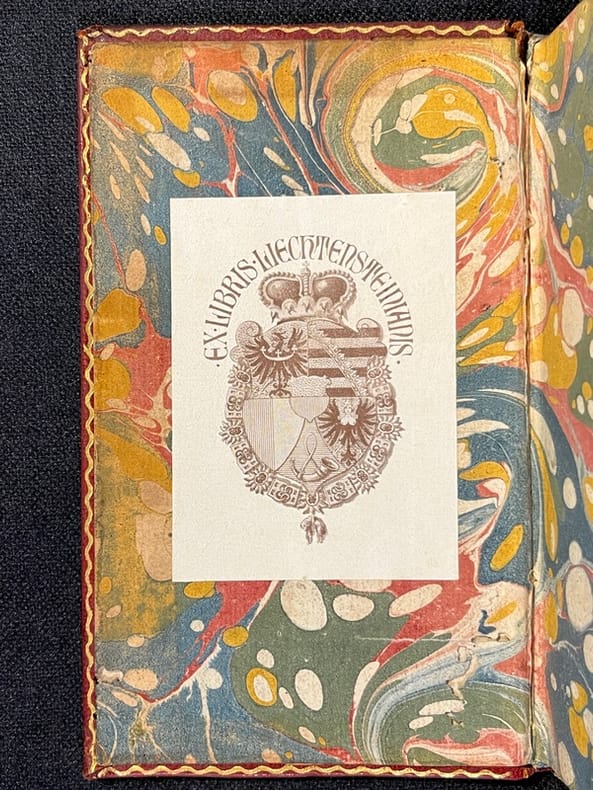 Travail d'insectes aux dos. Ex-libris Liechtensteinianis (Prince du Lichtenstein).