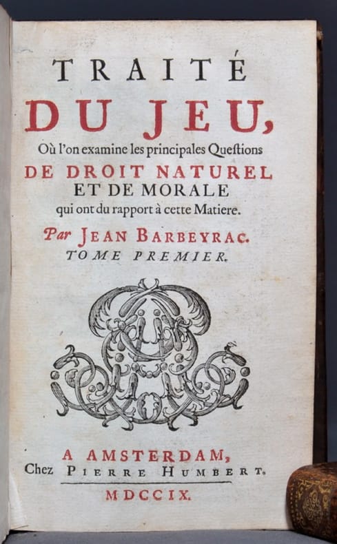 Joli frontispice au premier volume.Nice frontispiece in the first volume. Très rare édition originale de cette dissertation philosophique autour du jeu, de ses dangers et de ses abus. Jean Barbeyrac, né à Béziers le 15 mars 1674 et mort le 3 mars 1744, est un juriste français, connu surtout pour ses traductions des ouvrages de Samuel von Pufendorf sur le droit naturel. Issu d'une famille calviniste, neveu de Charles de Barbeyrac, il se réfugie en Suisse lors de la révocation de l'édit de Nantes. Après avoir passé quelques temps à Genève et à Francfort, il est successivement professeur de belles-lettres à l'école française de Berlin, professeur d'histoire et de droit civil à Lausanne et professeur de droit public à Groningue. Très rare édition originale de cette dissertation philosophique autour du jeu, de ses dangers et de ses abus. Avec Jean-Jacques Burlamaqui et Emer de Vattel, Barbeyrac est l'un des représentants les plus illustres de l'Ecole romande du droit naturel. Il a contribué à la formation du républicanisme moderne qui devint une source d'inspiration pour les révolutionnaires français et américains de la fin du XVIIIe siècle.Very rare first edition of this philosophical dissertation around the game, its dangers and its abuses. Along with Jean-Jacques Burlamaqui and Emer de Vattel, Barbeyrac is one of the most renowned representatives of the French-speaking Switzerland School of Natural Law. He contributed to the formation of modern republicanism which became a source of inspiration for French and American revolutionaries at the end of the 18th century.