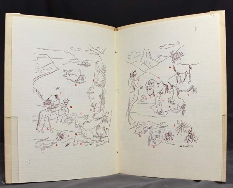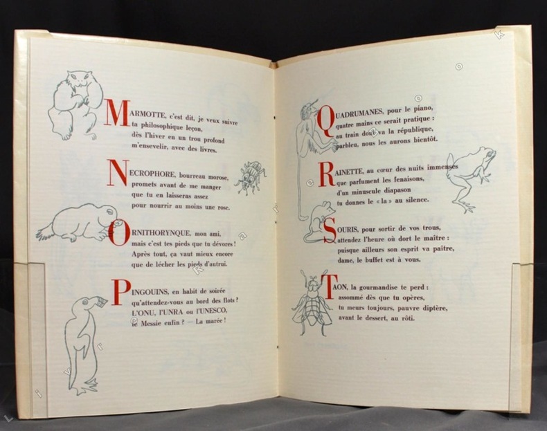Illustré à toutes pages en rouge et en gris par Géa Augsbourg avec, en entrée, un dessin à double page réunissant tous les animaux. Abécédaire animalier et poétique : un animal par lettre (imprimée en rouge), 4 vers par animal. Edition privée réservée aux clients, amis et connaissances du maître-imprimeur. Exemplaire numéroté (394). !!! !!! Du 3 octobre au 24 octobre il n'y aura pas d'expédition de colis: le libraire est en voyage. La librairie reste ouverte et nous répondrons sporadiquement aux emails. Merci pour votre compréhension. ––> From 3 October to 24 October, there will be no parcel deliveries as the bookseller will be travelling. The bookshop will remain open and we will respond to emails sporadically. Thank you for your understanding.