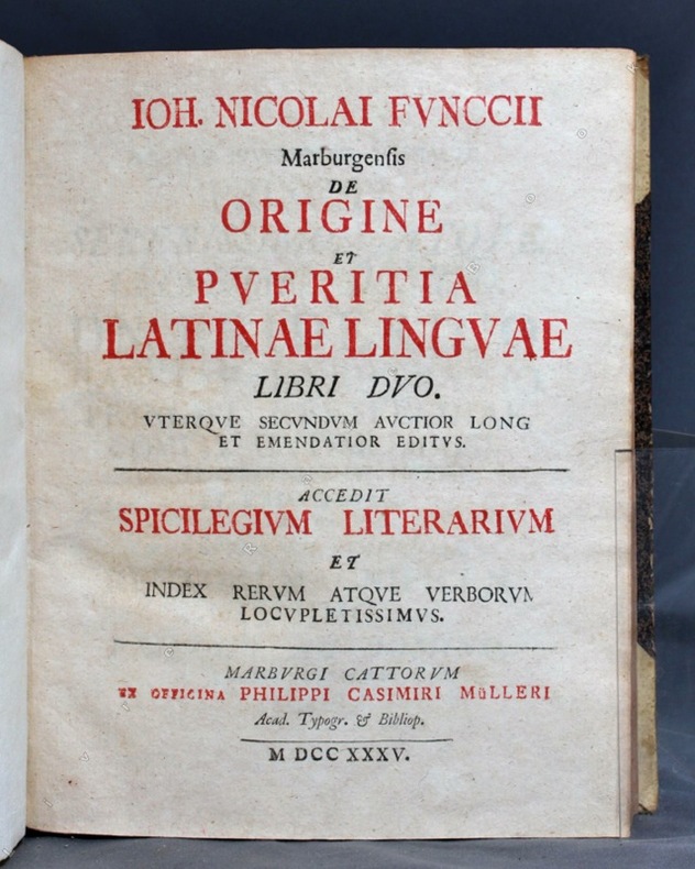 Marburgum Cattorum, Ex officina Philippi Casimiri Mülleri, 1735. In-8 de 10-355-[29-index] pages, demi vélin (un peu sali) à coins, titre doré au dos, ainsi que le chiffre 400 manuscrit. Papier des plats un peu frotté, inscription à la plume sur ff. vierge.