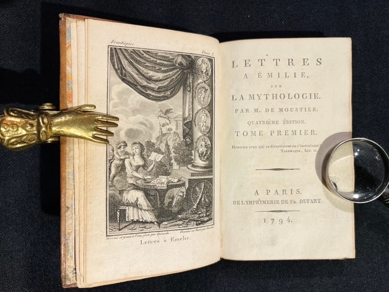 Lettres à Emilie sur la mythologie. Mention de quatrième édition. In 12 plein chagrin rouge à grain long, dos lisse, pièces de titre et tomaison cuir foncé, roulette, caissons, fers, filets dorés, triple filet doré encadrant les plats roulette dorée sur coupes. Roulette dorée intérieure, gardes à la cuve. 85x130mm. Tome 1 et 2 faux –titre- frontispice dessiné et gravé par QUVERDO terminé au burin par GAUCHER, titre, 128 pages- faux titre-titre, 101 pages, complet des 14 gravures hors texte, y compris le frontispice, par QUEVERDO, Tranches dorées ; A Paris de l’imprimerie de Fr DUFFART 1794. Frontispice- Vesta du Cibelle- Saturne-Jupiter- Junon- Minerve- Neptune- Cérès- Mercure- Diane- Apollon- Vulcain- Vénus- Mars; Très bon état.