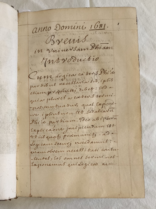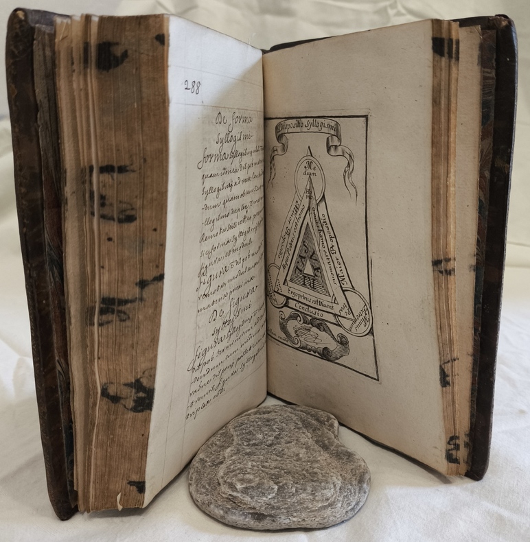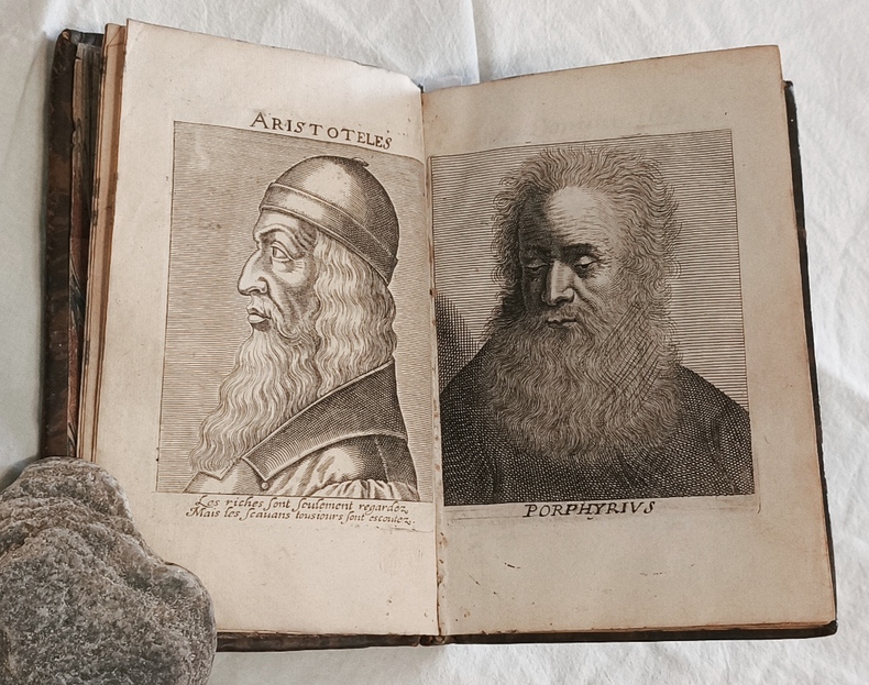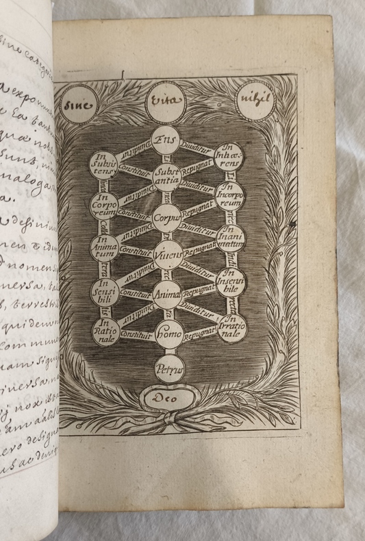 MANUSCRIT en latin rassemblant les principales notions de la philosophie et de la morale, incluant la logique la rhétorique et la cosmogonie. Illustré de 2 portraits gravés d’Aristotelès et de Porphyrius, et de 3 planches gravées représentant des schémas du syllogisme, de la logique, et l’arborescence de Porphyre Manuscrit d’une belle calligraphie.