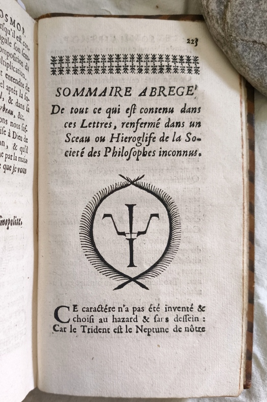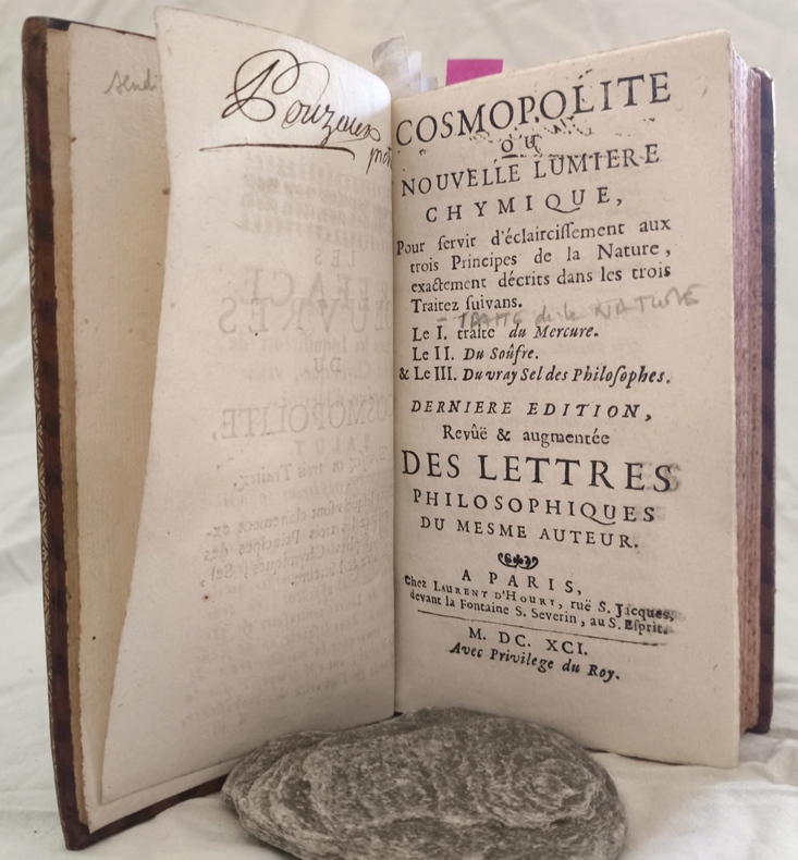 Recueil contenant : - Cosmopolite, ou Nouvelle lumière chymique. - Traité du soûfre - Traité du sel - Traité du Cosmopolite - Statuts des philosophes inconnus - Lettres de Michel Sendivogius. 53 lettres (très rares complètes) - Sommaire Abrégé Édition ornée d’un sceau gravé sur bois, celui des « philosophes inconnus », représentant le Trident de Neptune. Le premier ouvrage qui explique, l’équilibre de cette « société » au travers des Lettres « l’art général de changer les métaux les uns dans les autres ». Sendivogius, alchimiste polonais aurait délivré de prison Alexandre Seton, dit «le Cosmopolite», qui lui aurait transmis le secret de la poudre alchimique. Caillet, 10131 – Duveen, 542.