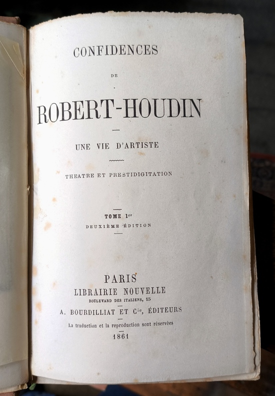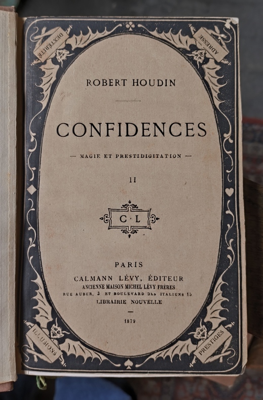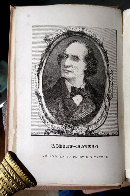 Portrait de Robert-Houdin. Grand maître de la prestidigitation, Robert-Houdin, nous donne ici les bases de la prestidigitation d’aujourd’hui. Très bon exemplaire avec les couvertures à la date de 1879.