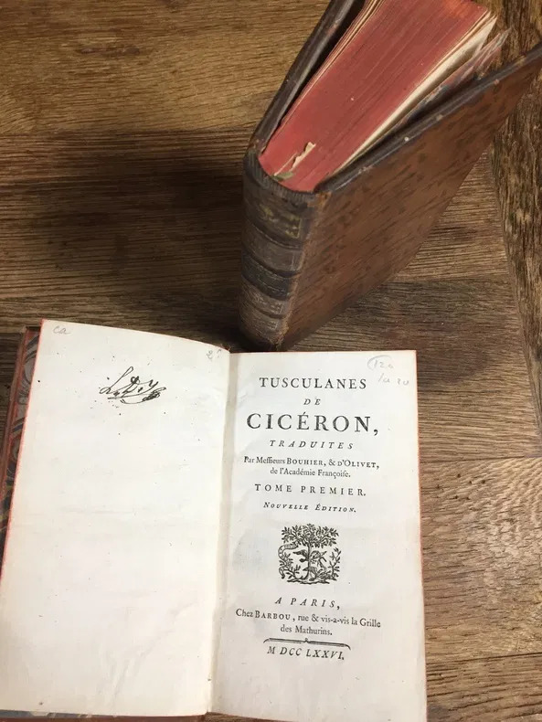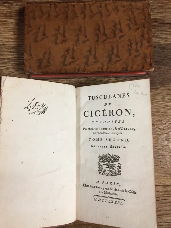 Reliure fin XVIIIe siècle plein cuir marbré. Dos à 5 nerfs, entre nerfs à caissons ornés de motifs floraux dorés. Pièces de titre cuir rouge, épidermures sur les pièces de tomaison. Ex-libris à l'encre.