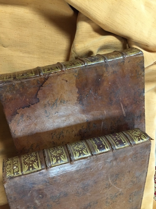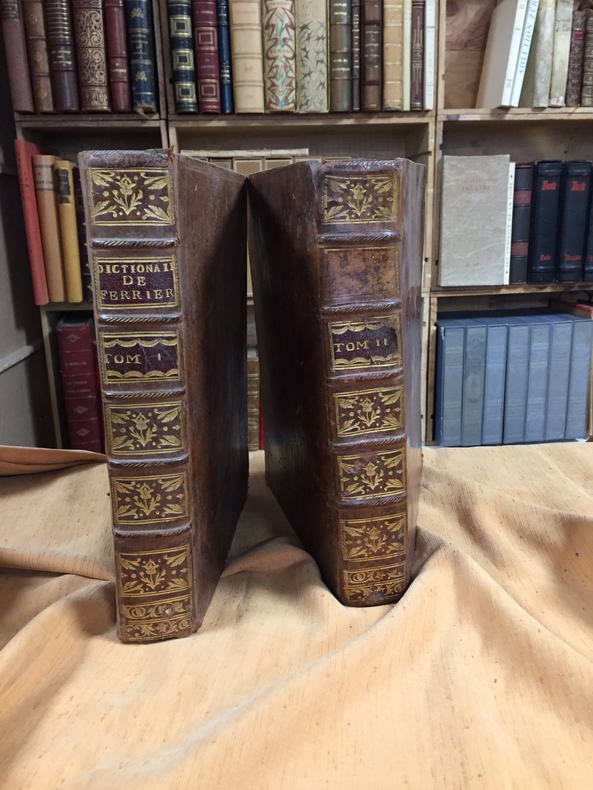 Reliure plein cuir.Tranches jaspées. Dos à 5 nerfs, pièces de titre et de tomaison dorés (pièce manquante sur le 2e tome), entre nerfs à feuillages dorés. Trous de vers sur la reliure (et intérieur du deuxième tome). État moyen.