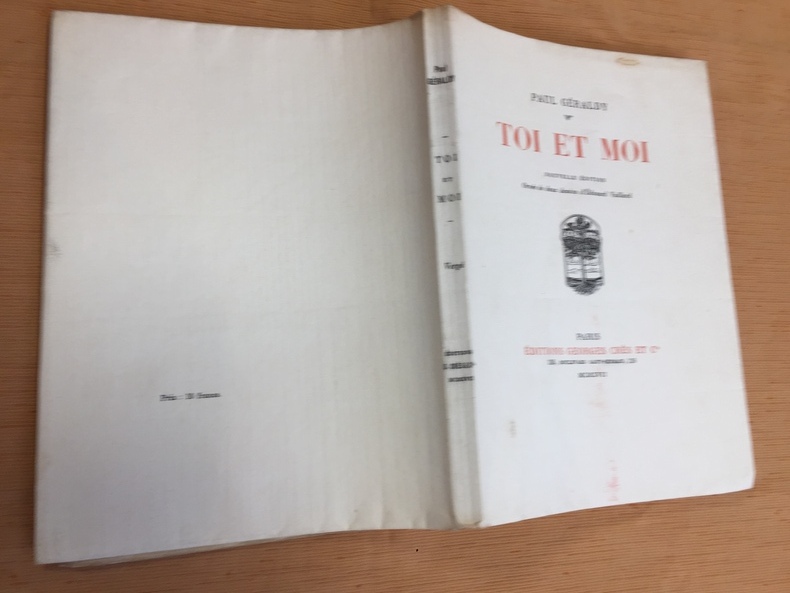 Envoi autographe de Paul Géraldy Lettre : " Mon cher ami, je répète l'après midi, et le matin je tourne chez Gammart. Je ne vois pas le moyen de passer vous voir avant quelques jours. Mais vous n'avez pas besoin de moi. Tout ce que vous ferez, sera bien fait.. il faut, n'est ce pas, accorder ( mots barrés ) la priorité demandée..Du moins pour un temps à déterminer, pour un an, je suppose, avec faculté de renouvellement, hein ?..Enfin, je vous le répète, je me fie à vous entièrement. Votre ami. Géraldy " vol relié, 180x110, bel état intérieur, 246pp. Couvertures d'origines conservées. Contrecollée enveloppe contenant la lettre. Paris, Stock, vers 1920 "Toi et Moi" est un recueil de poèmes de l'écrivain français Paul Géraldy, publié en 1912. Paul Géraldy, de son vrai nom Paul Lefèvre, était un poète et dramaturge français. "Toi et Moi" est considéré comme l'œuvre la plus célèbre de Paul Géraldy. Il s'agit d'un recueil de poèmes dédié à l'amour et aux relations amoureuses. Les poèmes explorent les différentes facettes de l'amour, depuis les premiers émois jusqu'aux joies et aux peines de la vie à deux. Les poèmes de "Toi et Moi" sont souvent empreints de sensualité et de romantisme. Ils expriment les sentiments intenses ressentis dans une relation amoureuse et explorent les thèmes de l'intimité, de la passion et de la complicité. Paul Géraldy était connu pour son style élégant et émotionnel. Ses poèmes sont empreints de lyrisme et de délicatesse, capturant les émotions les plus subtiles de l'amour. "Toi et Moi" a connu un grand succès à sa sortie et a été très apprécié par le public. Les poèmes de ce recueil ont souvent été cités et repris dans d'autres œuvres littéraires, et certains sont même devenus des classiques de la poésie amoureuse française. "Toi et Moi" reste une référence dans le domaine de la poésie amoureuse et continue d'être lu et apprécié par les amateurs de poésie romantique. ref/187