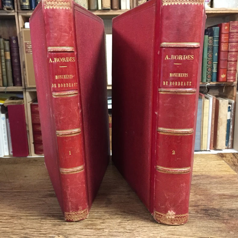 Superbe reliure signée pour cet excellent ouvrage orné de 70 belles gravures sur acier figurant les monuments et sites remarquables de la ville de Bordeaux. Le second tome se termine sur les "Notices sur les édifices et sur les principales localités du département de la Gironde". L'exemplaire est enrichi d'une rare quittance jointe, datée du 30 juillet 1847 et signée de l'auteur Auguste Bordes : "Je soussigné reconnais avoir reçu de M. Jabouin aîné marbrier pour les première & deuxième livraisons de l'Histoire des Monuments de Bordeaux par Mr. Auguste Bordes la somme de quatre francs". Bon exemplaire remarquablement établi dans une reliure de grande qualité par le relieur Garidel (arrivé à Paris en 1847 et installé à Saint-Germain-des-Prés en succession de Dubosc, dès 1861). Bon exemplaire (des rouss., très bel état par ailleurs) qu'il est très rare de trouver dans un si remarquable habit. A offrir ou à s'offrir ! Fléty, 77
