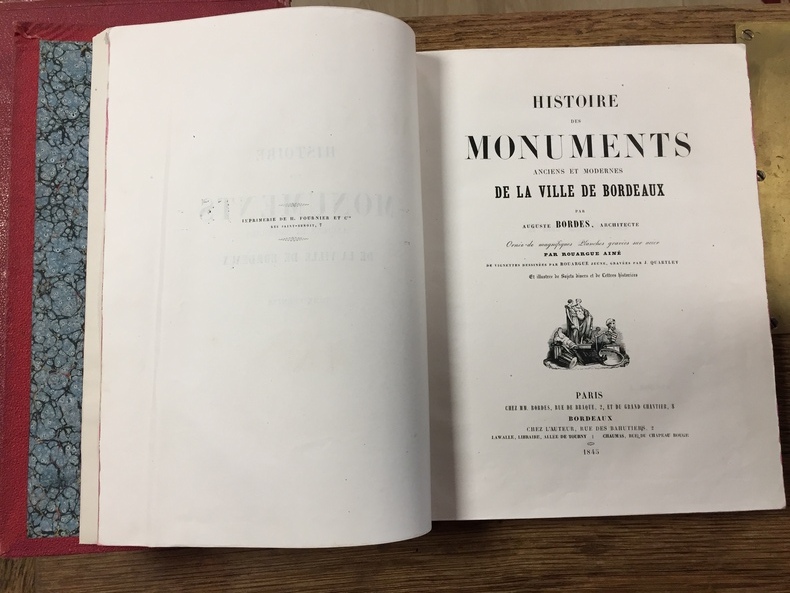 Exemplaire complet des 31 planches signalées en table y compris l'allégorie et un plan de Bordeaux non signalé. Etat moyen (dos fort. frotté, plusieurs cahiers brunis, une planche débroché, tome premier seul). Prix en l'état pour ce grand classique du régionalisme bordelais, écrit par un architecte et historien girondin. Les illustrations sont de Adolphe Rouargue (1810-1884), frère cadet d'un autre illustrateur, Emile Rouargue (ca 1795-1865). Pour son travail, A. Rouargue s'est basé sur des aquarelles réalisées par l'auteur, dont les originaux sont conservés de nos jours par les Archives Municipales et la Société archéologique de Bordeaux.