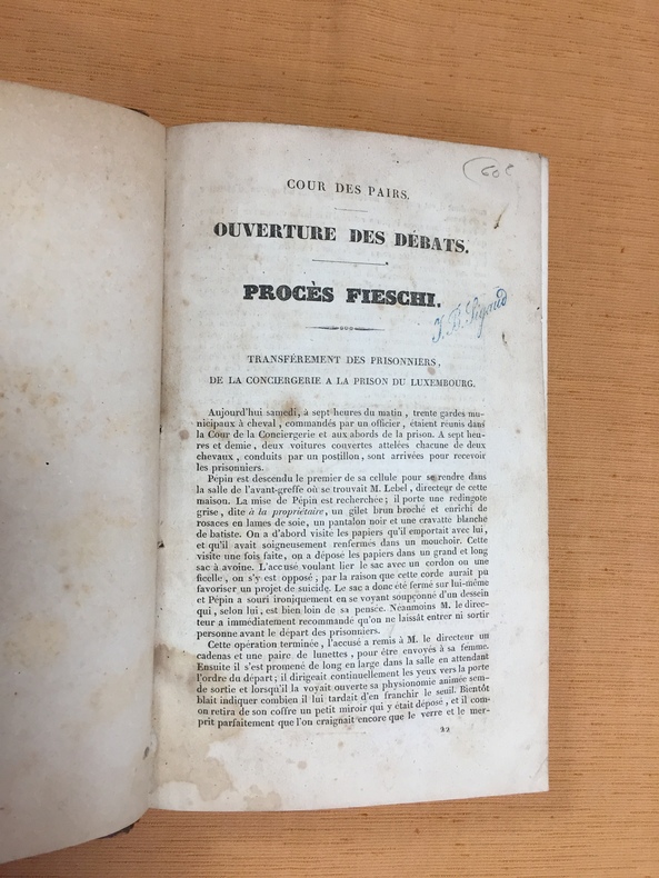 Paris chez A. Ernest Bourdin 1836 1 vol. relié 3 tomes en 1 fort vol. in-8, relié demi-basane tabac, dos lisse orné de filets et fleurons dorés, (4) + II + 404 + (4), 320 + 420 pp., 3 fac-similés et 7 planches en lithographie dont 4 portraits. Compte rendu détaillé du procès de Giuseppe Fieschi suite à son attentat à la "machine infernale" du 28 juillet 1835 contre Louis-Philippe. Il sera guillotiné le 19 février avec deux de ses complices. Manque la page de titre du tome II et le faux-titre du tome III. Reliure légèrement défraîchie, quelques rousseurs claires et une trace de mouillure aux premiers feuillets. Sinon agréable exemplaire.