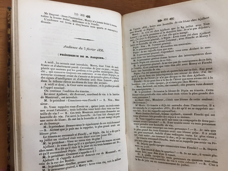 Trois volumes in 12°, demi veau blond , dos lisse orné de faux mors et faux caissons, avec un titre couleur noire.Les 3 tomes sont ainsi composés: Tome 1: (i-j) , 326 pages et une table. Tome 2: 320 pages. Tome 3: 420 pages.Les 3 tomes sont illustrés de 4 portraits dont celui de FIESCHIi, deux façades de maison, un dessin de la machine infernale et 3 fac-similés de documents autographes.Il s’agit bien essentiellement du compte rendu du procés consécutif à l’attentat du 28 juillet 1835 contre Louis Philippe. Le Roi en réchappa mais l’attentat fit 18 morts. FIESCHI et ses complices furent guillotinés.Quelques discrets signes d’âge mais globalement TRES BON ETAT.