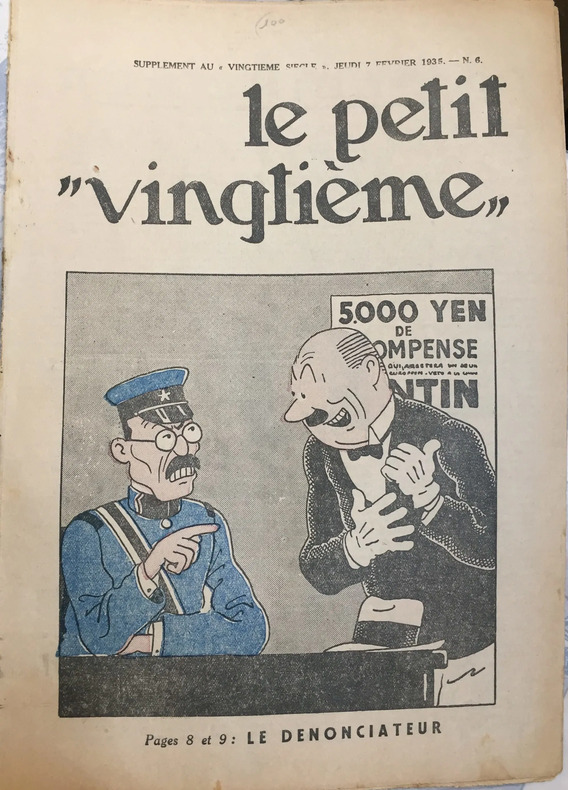 Revue "Le Petit Vingtième", Supplément au « Vingtième siècle », jeudi 7 février 1935, n°6 . 16 pages en feuillets. Illustration de Hergé en couverture extraite de « Les Aventures de Tintin en Extrême-Orient » publiées en pages centrales. Supplément hebdomadaire du journal Le Vingtième Siècle célèbre pour les premières aventures de Tintin. Exemplaire bien complet.