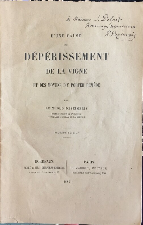 Reinhold DEZEIMERIS, « D’une cause de dépérissement de la vigne et des moyens d’y porter remède », Féret et fils libraires éditeurs, Bordeaux, G.Masson éditeur, Paris, 1887, 20 pages. Brochure. Bon état.