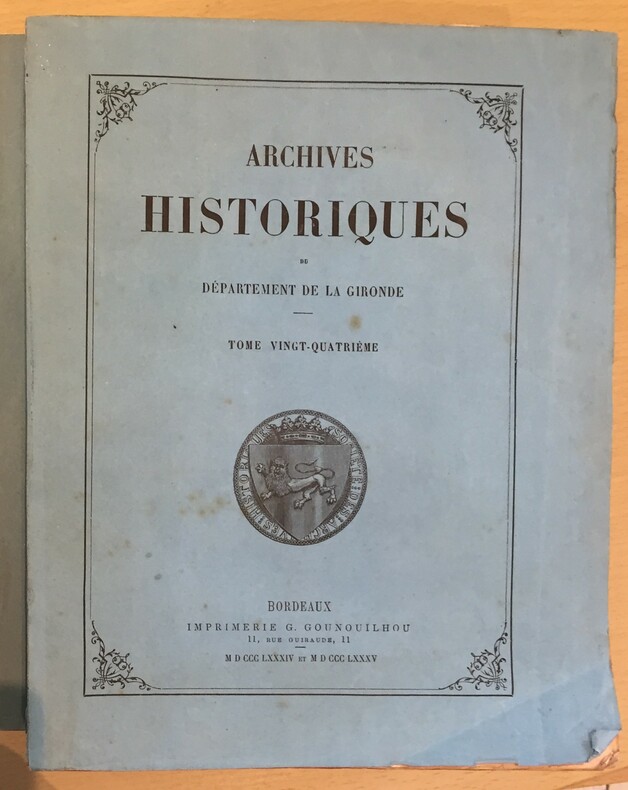 Archives Historiques du Département de la Gironde - Tome 24. G.Gounouilhou imprimeur, Bordeaux, 1884-1885, xxvii+592 pages. Broché, Les pages ne sont pas coupées. Couverture bleue état d’usage. Table chronologique des documents en tête d’ouvrage et table des matières en fin d’ouvrage.