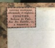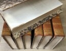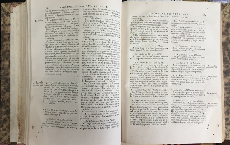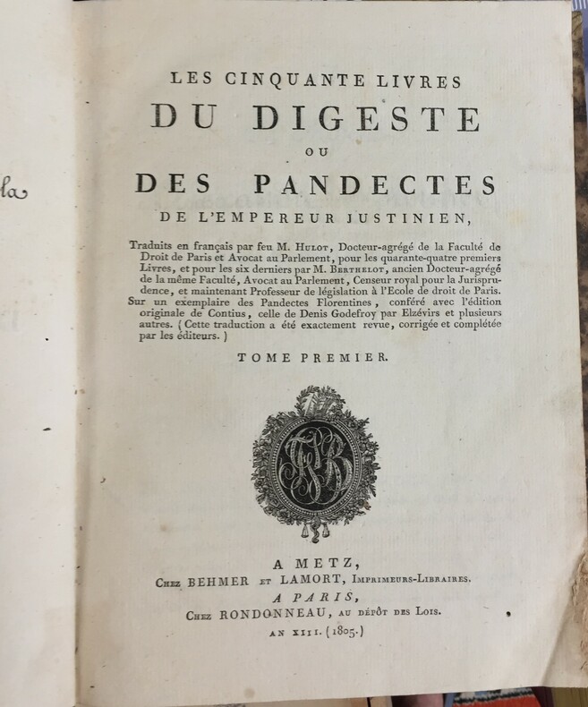 Les Cinquante Livres du Digeste ou des Pandectes de l’empereur Justinien – Bien complet de ses 7 tomes. A Metz, chez Behmer et Lamort, imprimeurs-libraires, à Paris chez Rondonneau, an XIII (1805). Reliure française allemande et anglaise, Chrétien, relieur de Paris installé à Bordeaux. Texte sur deux colonnes, en français sur la première et en latin sur la deuxième. Dos cuir havane, faux nerfs dorés, titre, tomaison et propriétaire en lettres dorées sur le dos. Très bon état. Le bord de la reliure du premier volume est de 1,5cm. Petit manque en coiffe de queue du volume 7. Trois trous de vers affectant le coin des pages du premier volume, sans incidence sur le texte.