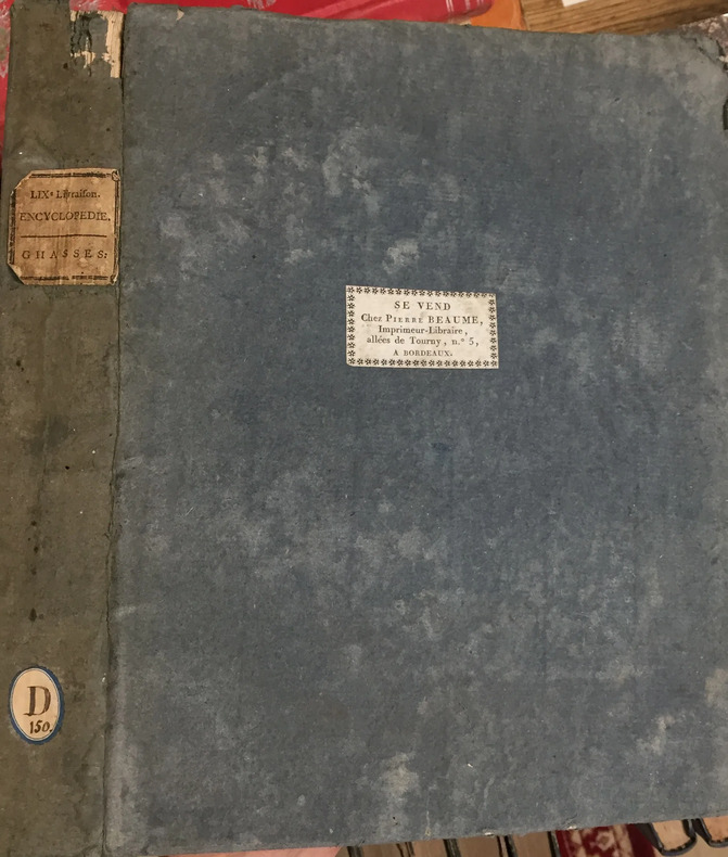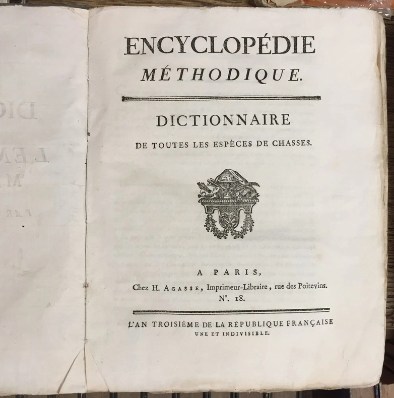 Dictionnaire de toutes les espèces de chasses– Encyclopédie méthodique (dictionnaire de l’Encyclopédie méthodique ou par ordre de matières) + « Explication suivie de trente-deux planches, et des figures concernant les différentes espèces de Chasses tome IX des gravures des Arts ». (texte seul, manque l’ouvrage de planches). A Paris chez H. Agasse, imprimeur libraire, l’An Troisième de la République française une et indivisible (1794). Viii+456 pages. Reliure en fin cartonnage d’attente recouvert d’un vergé bleu. Texte sur deux colonnes. Quelques pages ne sont pas coupées. A toutes marges.