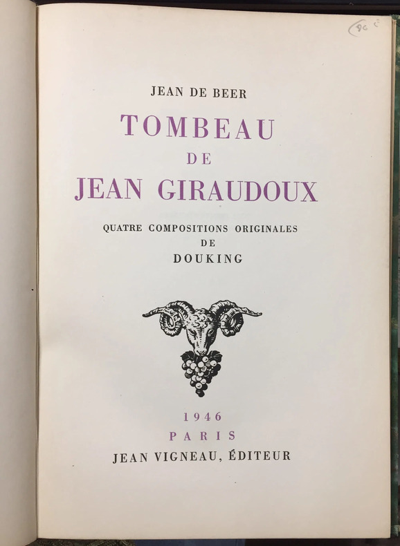 Tombeau de Jean Giraudoux. Quatre compositions originales en couleurs de Douking. (Paris: Jean Vigneau, 1946). [M.C.: littérature, théâtre, Giraudoux]