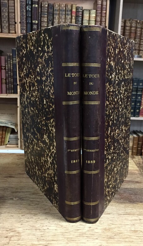 Edouard CHARTON (ss dir.) "Le Tour du Monde. Nouveau journal des voyages illustré par nos plus célèbres artistes" – 1889, 1er et 2ème semestres, 2 volumes Librairie Hachette et Cie, Paris, 1889, 1er et 2e semestres, 436 et 436 pages. Très nombreuses illustrations. Reliure demi cuir brun, plats cartonnés. Au dos lettrages et filets dorés. Texte sur deux colonnes.