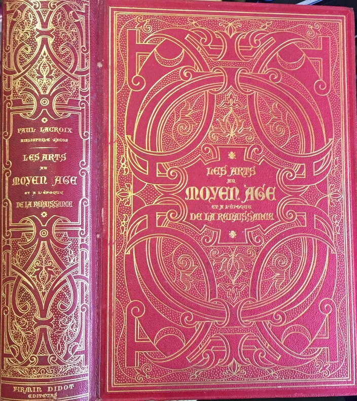 LACROIX PaulLes Arts au Moyen-Âge et à l'époque de la Renaissance.Firmin Didot Et Cie, Paris, 1877. fort In-4°, belle reliure demi-chagrin cerise à coins, tête dorée, 576 pp., illustré de 20 planches Chromo-lithographiques exécutées par F. Kellerhoven et de 400 gravures sur bois, un coin cassé & un autre émoussé, quelques rousseurs.Agréable exemplaireAmeublement civil et religieux. Tapisseries. Céramique. Armurerie. Sellerie et carrosserie. Orfèvrerie. Horlogerie. Cartes à jouer. peinture sur verre. Peinture à fresque. Peinture sur bois, sur toile. Gravure. Sculpture. Archtecture. Parchemin, papier. Manuscrits. Miniatures des manuscrits. Reliure. Imprimerie. Musique. Instruments de musique. Table des figures.