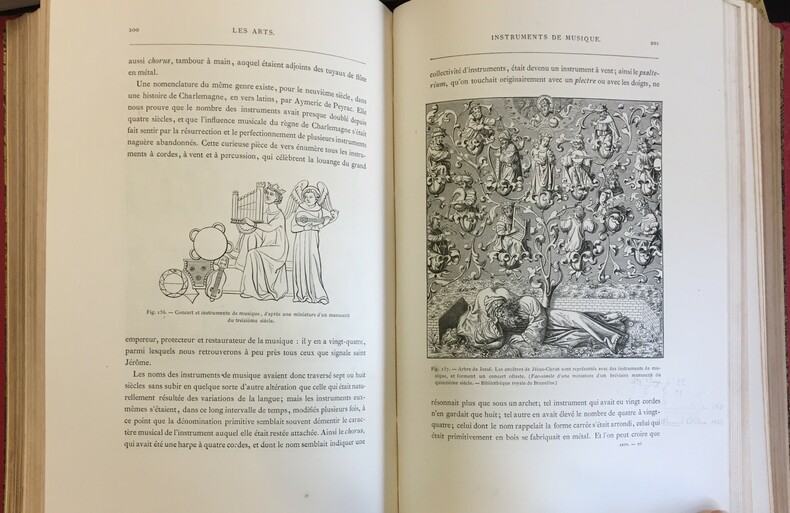 Paris, Firmin-Didot 1873-1877 Série complète de 4 volumes sur le moyen age et la renaissance, I: v,577 pp.illustré de 14 chromolithographies et de 410 gravures sur bois gravées par Huyot père et fils (2e éd.), II: iv,603pp. illustré de 15 chromolithographies et de 440 gravures sur bois (4e éd.), III: 548pp.illustré de 19 chromolithographies et de 400 gravures sur bois (5e éd.), IV: iv,612pp.illustré de 13 chromolithographies et de 400 gravures sur bois, reliures d'éditeur plein-cuir rouge avec décorations dorées, toutes tranches dorées, 29cm., bel état