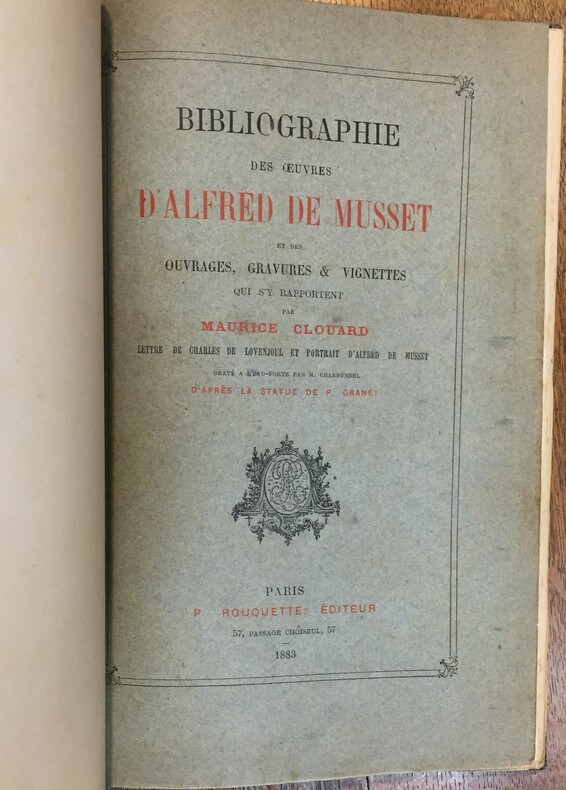« Bibliographie des œuvres d’Alfred de Musset et des ouvrages, gravures et vignettes qui s’y rapportent » - Avec Lettre de Charles de Lovenjoul et portrait d’Alfred de Musset gravé à l’eau-forte par M.Charbonnel d’après la statue de P.Granet. P.Rouquette éditeur, Paris, 1883, xxiv+98 pages. Reliure demi cuir bleu à 5 nerfs, lettrages dorés. (coiffe de queue et un nerf légèrement frottés). La couverture bleue d’attente a été conservée. Bon état.