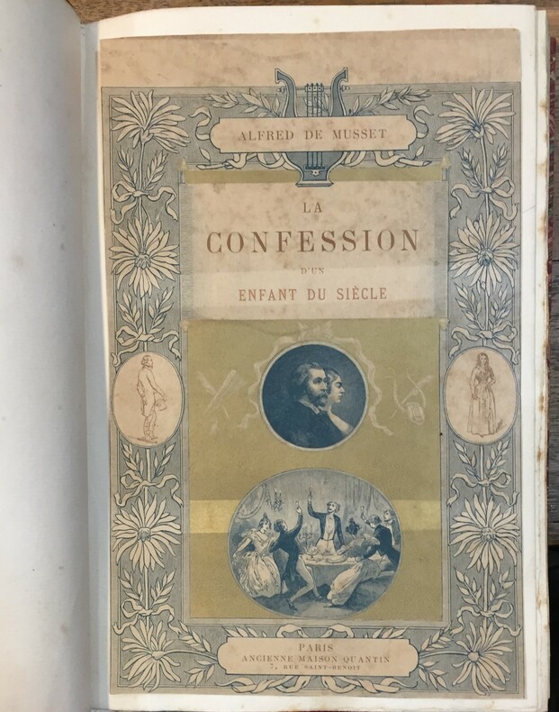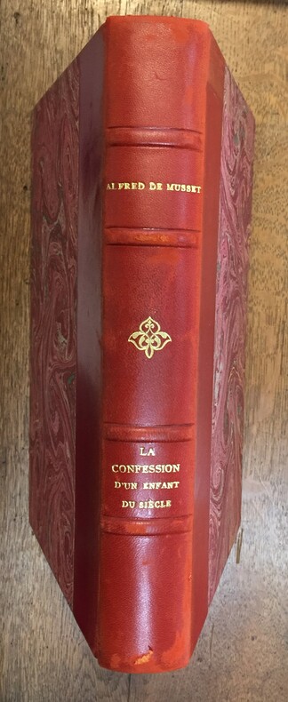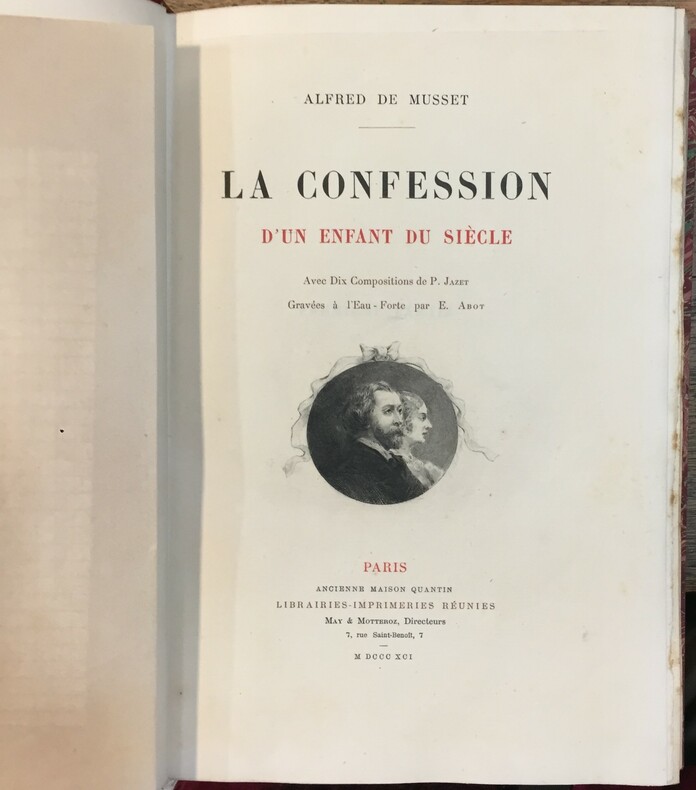 « La confession d’un enfant du siècle » - Avec 10 compositions de P. Jazet gravées à l’eau-forte par E. Abot. Ancienne Maison Quentin, librairies imprimeries réunies, Paris, 1891, 334 pages. Cette édition a été tirée à 620 exemplaires tous numérotés à la presse, celui-ci n°281 sur vergé de Hollande. La couverture d’origine a été découpée et insérée en feuille volante. Reliure demi cuir rouge, dos à 4 nerfs. Titre auteur et fleuron dorés. Petite épidermure au dos. Dos légèrement insolé, sinon belle reliure. Intérieur très bon, à toutes marges, petites rousseurs en gouttière.