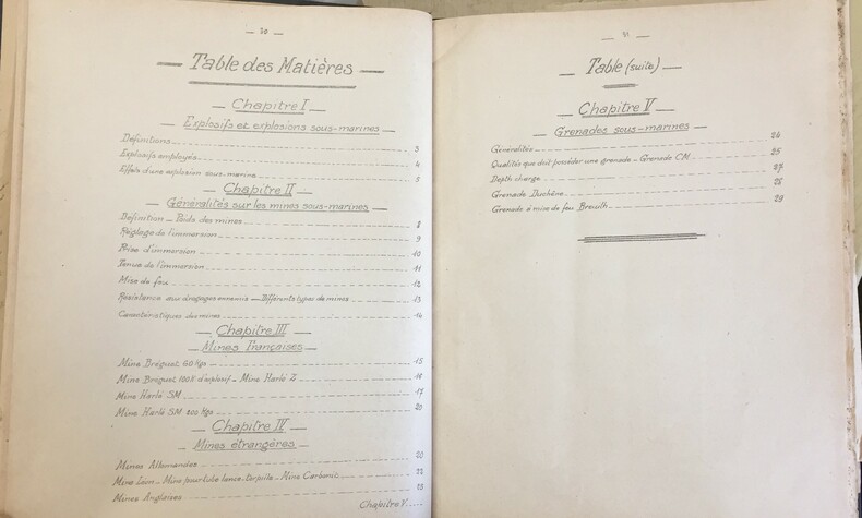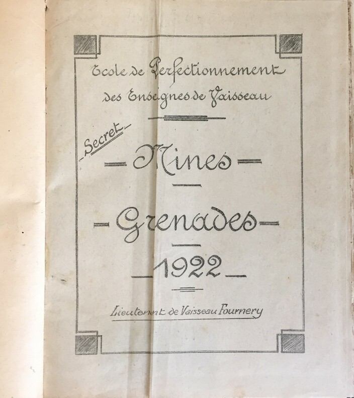 « Mines, Grenades -Secret » - 1922, 31 pages+table ; Suivi de « Compléments aux instructions sur les Torpilles automobiles », mai 1921, 52 pages+table ; Suivi de Addendum au Cours des Torpilles, 5 pages. Illustrés de 14 planches pleine page, 15 figures, 4 plans détachés. "Secret" Ecole de perfectionnement des Enseignes Vaisseau. Copie d'un manuscrit. Reliure pleine toile marron, pièce de cuir rouge au dos.