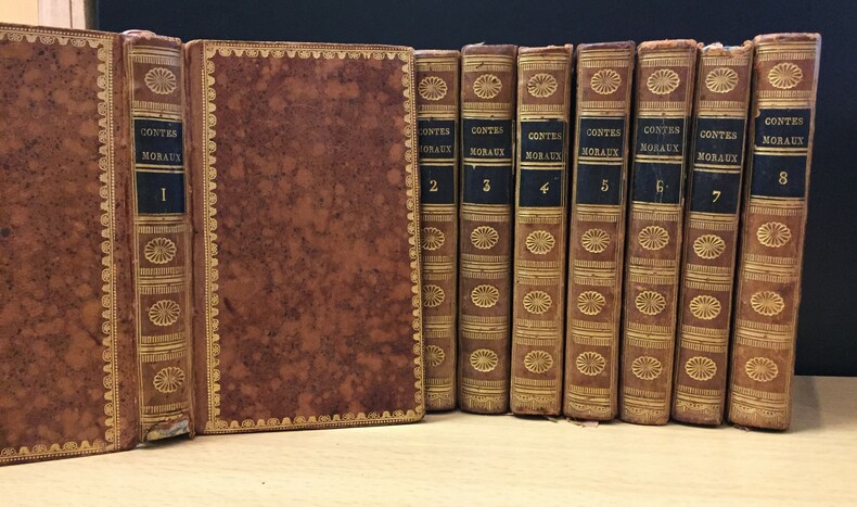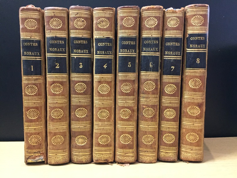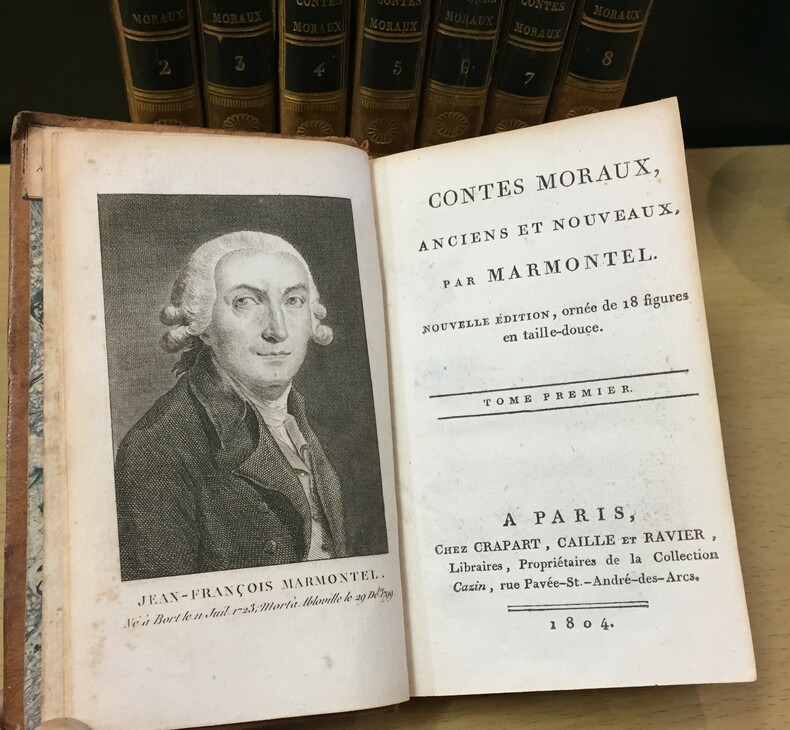 Nouvelle édition ornée de 18 figures en taille-douce. A Paris chez Crapart, Caille et Ravier libraires, propriétaires de la Collection Cazin, 1804. 4ff+216+1ff ; 4ff+215+1ff ; 4ff+254+1ff ; 4ff+209+1ff ; 4ff+243+1ff ; 4ff+252+1ff ; 3ff+229+1ff ; 3ff+274+2ff. Les volumes 1 à 4 contiennent les contes moraux publiés entre 1755 et 1759 au Mercure. Les 4 volumes suivant contiennent les nouveaux contes moraux écrits entre 1790 et 1792 (5. la veillée ; Le franc breton ; 6. Les déjeuners du village ou les aventures de l’innocence ; L'erreur d'un bon père ; Palémon, conte pastoral ; Les solitaires de Murcie ; 7. Les bateliers de Besons ; Il le falloit ; La côte des deux amans ; 8. Le trépied d’Hélène ; La leçon du malheur ; L’école de l’amitié ; La cassette ; Les rivaux d’eux-mêmes.) Reliure plein veau marbré. Plats ornés d’une dentelle, dos lisses, caissons ornés d’une fleur dorée, pièces de titre et tomaison de cuir noir. Signets. Délicats petits in-12 au papier en très bon état. Manque sur les coiffes des tomes 1 et 7.