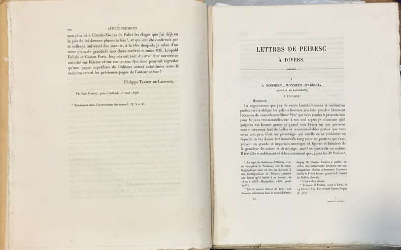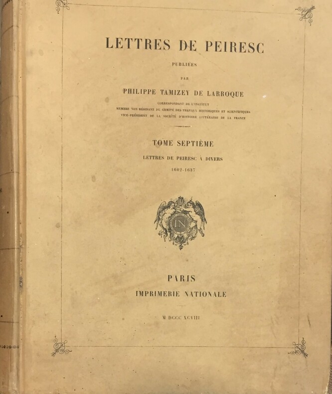 Publiées par Philippe Tamizey de Larroque, Imprimerie Nationale de Paris, 1898, Tome septième, Lettres de Peiresc à Divers, 1602-1637, viii+983 pages. Collection de Documents inédits sur l’histoire de France publiés par les soins du ministre de l’Instruction publique, Deuxième série. Les lettres de Peiresc ont été publiées par Tamizey de Larroque (1828-1898) entre 1888 et 1898.