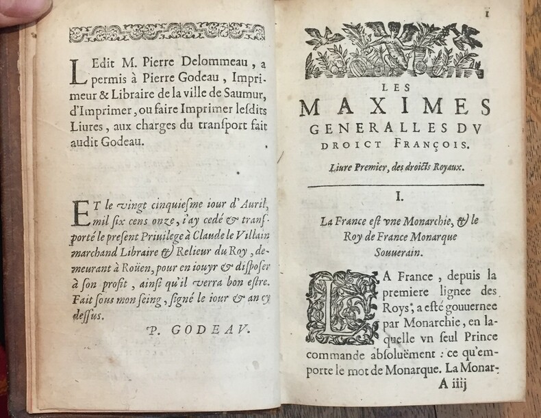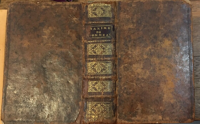 1631 - 5ff.+845+tables+2ff. Reveu, corrigé et augmenté outre les précédentes impressions. A Rouen, chez Claude La Villain, Libraire et Relieur du Roy demeurant à la ruë du Bec, à la bonne Renommée, 1631, Pierre Delommeau, sieur du Verger, conseiller du Roi en la Sénéchaussée de Saumur. Reliure plein veau marbré, tranches rouges. Manque en coiffe de tête et sur deux coins, les mors sont secs. Dos à 5 nerfs, motifs dorés, pièce de titre en cuir, titre doré. Reliure XVIIIe, les marges ont dû être rognées pour cette reliure. Ex-libris collé en contre plat daté de 1750.