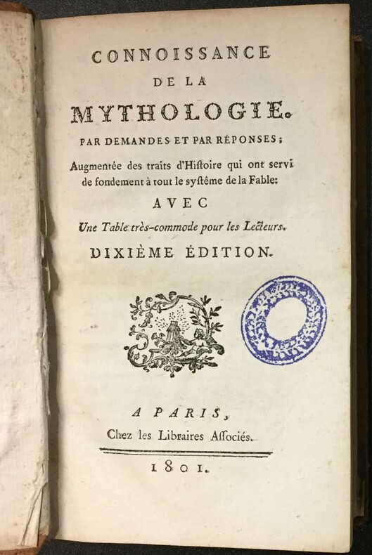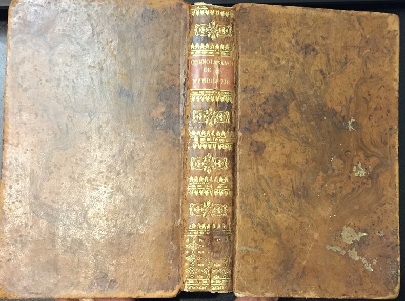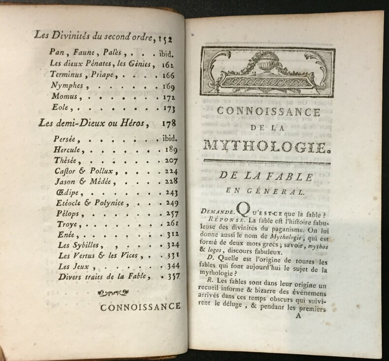 1- de la fable en général, des divinités du premier ordre : Saturne, Cybèle, Cérès, Jupiter, Junon, Apollon, Diane, Bacchus, Mercure, Vénus, Esculape, Neptune, Pluton, Mars, Minerve, Vulcain. 2- les divinités du second ordre : Terminus, Priape, Mymphes, Eole, Pénates, etc. 3- les demi-dieux ou héros : Persée, Hercule, Oedipe, Troie, Enée, etc...... Bel Exemplaire....RARE...en bon état (good condition). en trés bon état