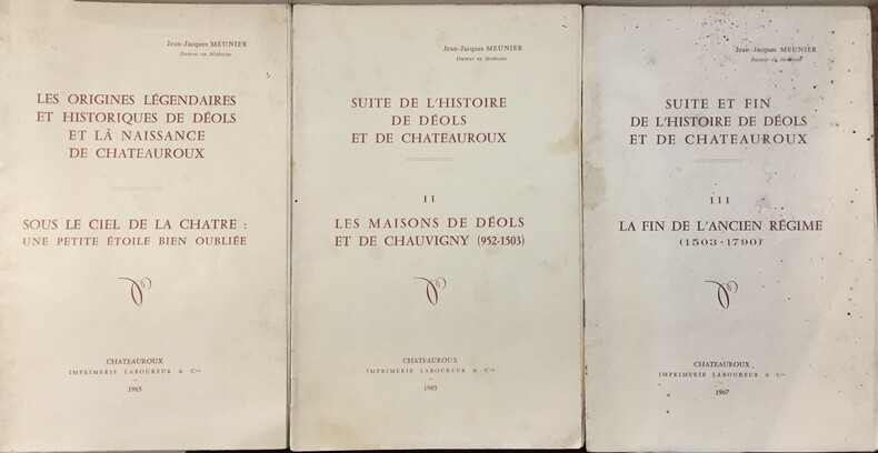 T1. Sous le ciel de la Chatre : Une petite étoile bien oubliée ; T2. Les maisons de Déols et de Chauvigny (952-1503) ; T3. La fin de l’Ancien Régime (1503-1790). Imprimerie laboureur et Cie, Chateauroux, 1965, 1967. Extrait de la Revue de l’Académie du Centre, 1964. Trois brochures numérotées, T1. n°LIII (pp.23-56), T2. n°90 (pp.1-32), T3. sn. (1-44). Couvertures agrafées, brunies, T3 petite taches d’encre.