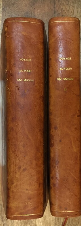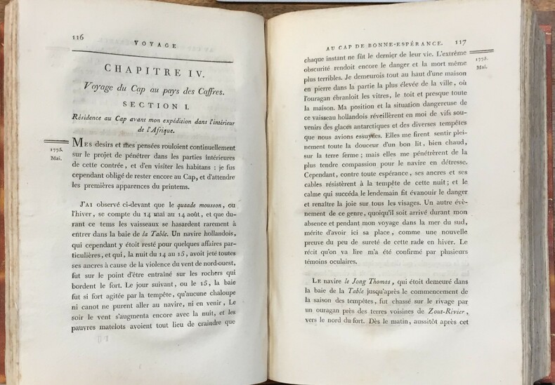 Chez Buisson libraire, Paris, 1787, 2 vol in-4° (25,5x18,7cm). Avec cartes, figures et planches en taille douce. Traduit par M. Le Tourneur. Il s’agit de l’édition originale de la traduction française de Le Tourneur, parue simultanément en 3 volumes in-8 chez le même éditeur. T1. [2] ff. (faux titre, titre) + frontispice (une gravure des environs du Cap de Bonne Espérance) + carte du Cap de Bonne Espérance pliée) + XXI (préface, introduction) + [3] pp. (approbation, privilège) + 478 pp. (dont explication des planches, table) + 7 planches (2 sont dépliantes, 3 ont été rognées). T2. [2] ff. (faux titre, titre) + 462 pp. (dont vocabulaire, table) + 7 planches (la numérotation est désordonnée). Reliure demi basane havane de petite facture. Dos lisse avec petites épidermures. Petit manque sur la carte du Cap de Bonne Espérance. Les pages ont été rognées, emportant le pli de deux planches, ce qui explique le prix de cet exemplaire.