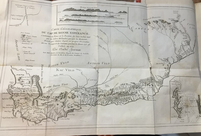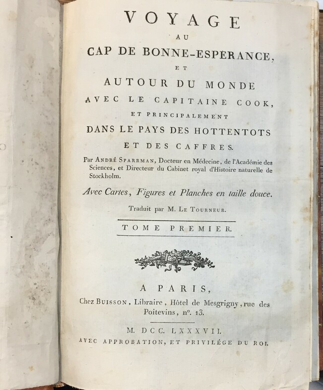 Anders Sparrman (1748-1820), naturaliste suédois et élève de Linné, rencontra au cap de Bonne-Espérance le capitaine James Cook et les naturalistes Reinhold et Georg Forster, qui lui proposèrent de les accompagner dans leur voyage autour du monde en qualité de botaniste. Il participa ainsi à l'expédition de novembre 1772 à mars 1775. À son retour au Cap, il entreprit d'explorer les terres sauvages de l'Afrique du Sud et voyagea à travers une foule de périls, au milieu des bêtes féroces, d'habitans perfides, avec un incommode chariot, et continuellement suspendu entre des précipices effrayans et des rivières rapides, dans un pays où l'on ne trouve jamais de ponts, et point de chemin (p. IX de la préface). L'ouvrage contient un vocabulaire de la langue des Hottentots et des Caffres. P2-6A