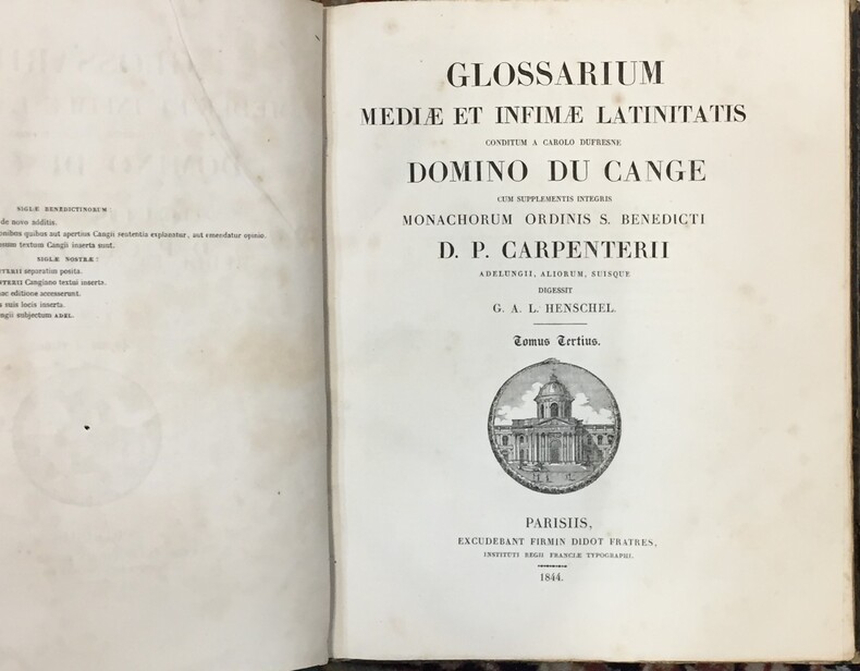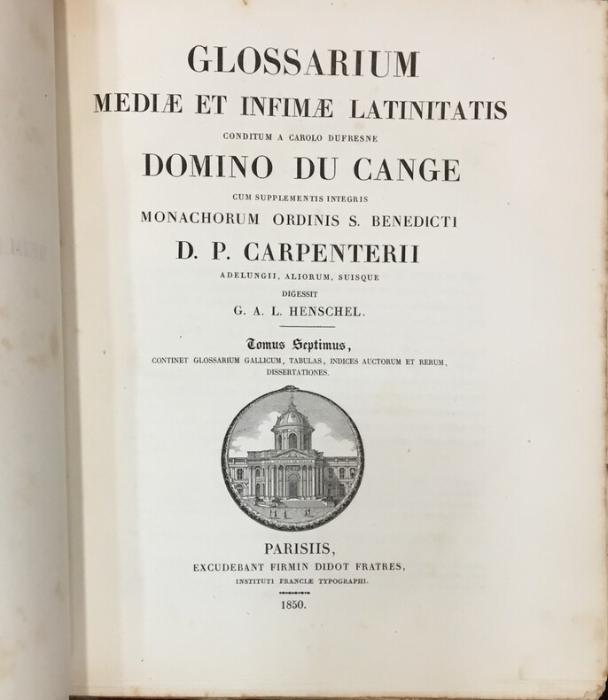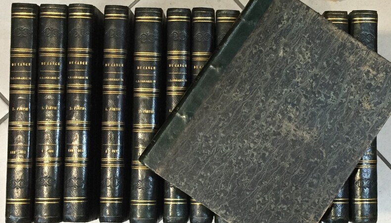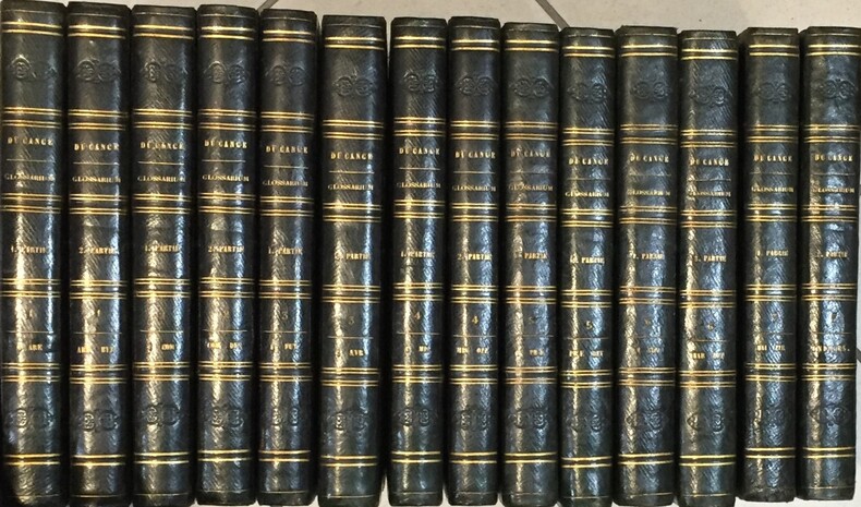 La première édition est parue en 1678 en trois volumes. La deuxième édition parue 1733-1736 est le travail des bénédictions de la congrégation de Saint-Maur qui en augmentent le contenu. Nous devons la troisième édition parue en 1766 à Pierre Carpentier qui a ajouté un supplément de 4 volumes d’articles. Cette édition dû à G.A. Louis Henschel, est la plus importante. Elle intègre les éditions précédentes des Bénédictins (1733-1736) et de D.P. Carpentier (1766) et réunit deux tomes d’annexes. Elle est reconnue comme la meilleure édition de ce glossaire, et la plus pratique d'usage, puisque les suppléments y sont intégrés. Ce glossaire constitue un instrument de travail jamais remplacé et encore indispensable pour les médiévistes. "A quarante-cinq ans, [Du Cange] n'avait encore rien publié, mais il avait des coffres pleins de registres dont les pages, consacrées chacune à une rubrique alphabétique, étaient couvertes d'extraits textuels ou de références sur les sujets les plus divers. Il s'était constitué ainsi une sorte de dictionnaire encyclopédique du moyen âge où des questions de tout ordre étaient traitées d'après les textes originaux ou, pour mieux dire, au moyen de la juxtaposition de ces textes : "histoire, jurisprudence, littérature, antiquités, inscriptions, médailles, monnaies, etc." [...] Il résolut de publier, sous sa responsabilité, les matériaux qu'il avait réunis en forme de "Glossaire" : Glossarium ad scriptores mediae et infimae latinitatis (Paris, 1678, 3 vol. in-folio). Cet ouvrage n'est donc pas, en dépit de son titre, un travail lexicographique sur le latin du moyen âge [...] c'est une encyclopédie des choses du moyen âge, suivant l'ordre alphabétique des mots latins qui servaient à les désigner. Chaque article est un recueil de textes enchâssés, en certains cas, dans une dissertation : ainsi s'explique l'extraordinaire étendue des articles Annus et Moneta, par exemple, véritables traités de chronologie et de numismatique [...]. Quelle que fût la valeur de ce plan singulier, l'exécution était de nature à justifier l'admiration presque universelle que le "Glossaire" inspira : non seulement l'auteur avait fait preuve d'immenses lectures, mais d'une aptitude exquise à interpréter les textes difficiles." (Langlois, Manuel de bibliographie historique, pp. 305 à 307). "Cette édition, dans laquelle tous les suppléments ont été fondus en un seul corps d'ouvrage, est d'un usage plus commode que l'ancienne édition [1733], et elle présente des additions de quelque importance. Le septième volume est composé du Glossaire français, de la table des mots techniques, de celle des mots étrangers, de l'index des textes et des manuscrits cités dans l'ouvrage, des dissertations qui se trouvent dans le Joinville et dans le Villehardouin de Du Cange, enfin de sa dissertation sur les monnaies byzantines." (Brunet).