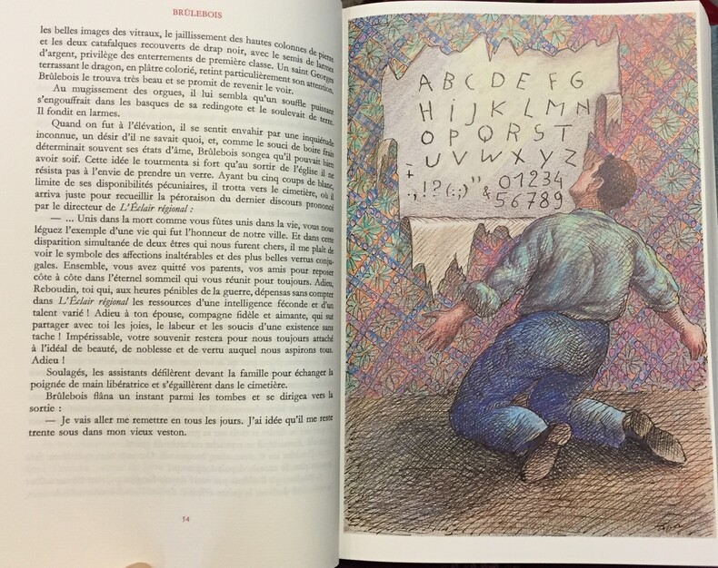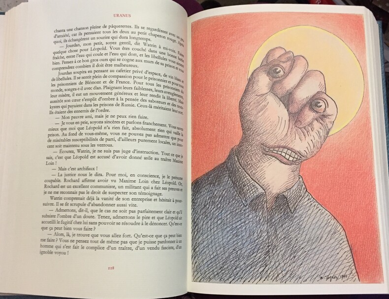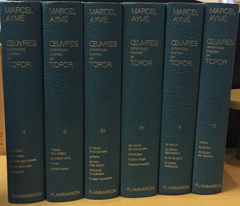 Exemplaire sur vergé des Papeteries de Guyenne numérotés, Illustrations de Roland Topor, 6 vol. in-4 cartonnage éditeur sous étui, tranches sup. argentée, Flammarion, Paris, 1977.Rappel du titre complet : Oeuvres Romanesques (6 Tomes - Complet) Tome 1 : Brûlebois - Aller-retour - La table aux crevés - La rue sans nom - Le vaurien ; Tome 2 : Le Puits aux images - La jument verte - Le nain - Maison basse ; Tome 3 : Le moulin de la Sourdine - Gustallin - Derrière chez Martin - Silhouette du scandale - Le Boeuf clandestin ; Tome 4 : Les Contes du Chat perché - Travelingue - La belle image - Le Passe-muraille ; Tome 5 : La Vouivre - Le chemin des écoliers - Le vin de Paris - Le confort intellectuel ; Tome 6 : Uranus - En arrière - Les tiroirs de l'inconnu - La fabrique - Samson 05