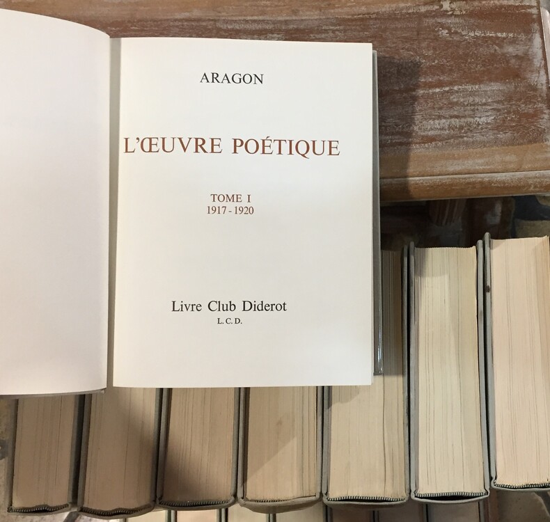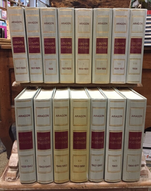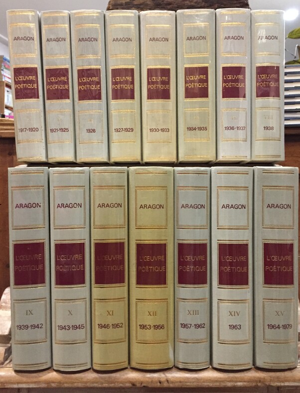 Livre Club Diderot (L.C.D.), 1974-1981. 15 volumes in-8 carrés. Edition Originale de l’Oeuvre poétique d’Aragon. Reliure pleine toile traitée soie spécialement teinte en gris perle à la demande de l’auteur. Dos lisses titrés rouge et or. 5 dos sont jaunis. Ensemble en très bonne condition. sous rhodoïd.